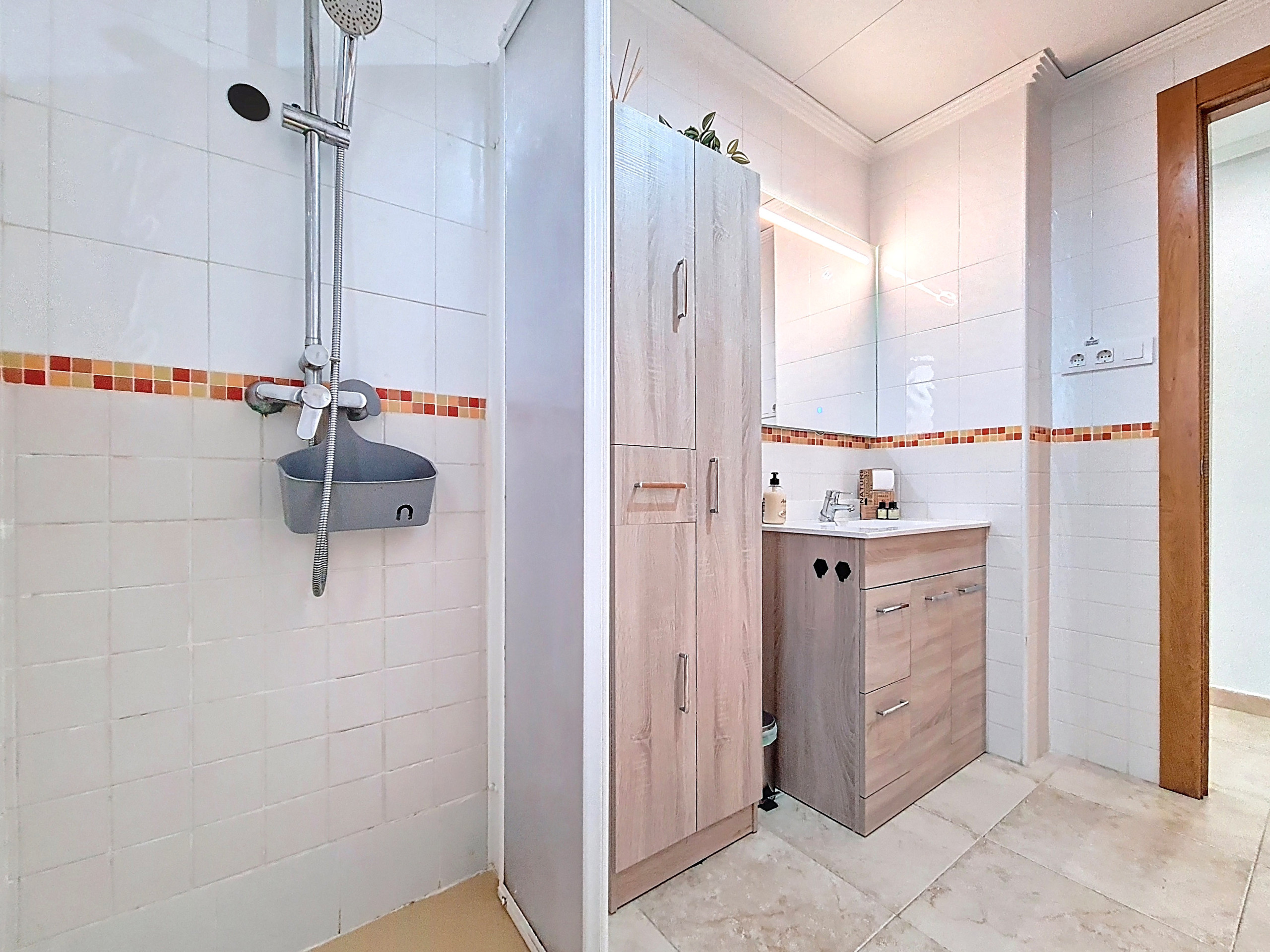 De woning beschikt tevens over een nette badkamer met een inloopdouche, afgewerkt in een smaakvolle stijl.