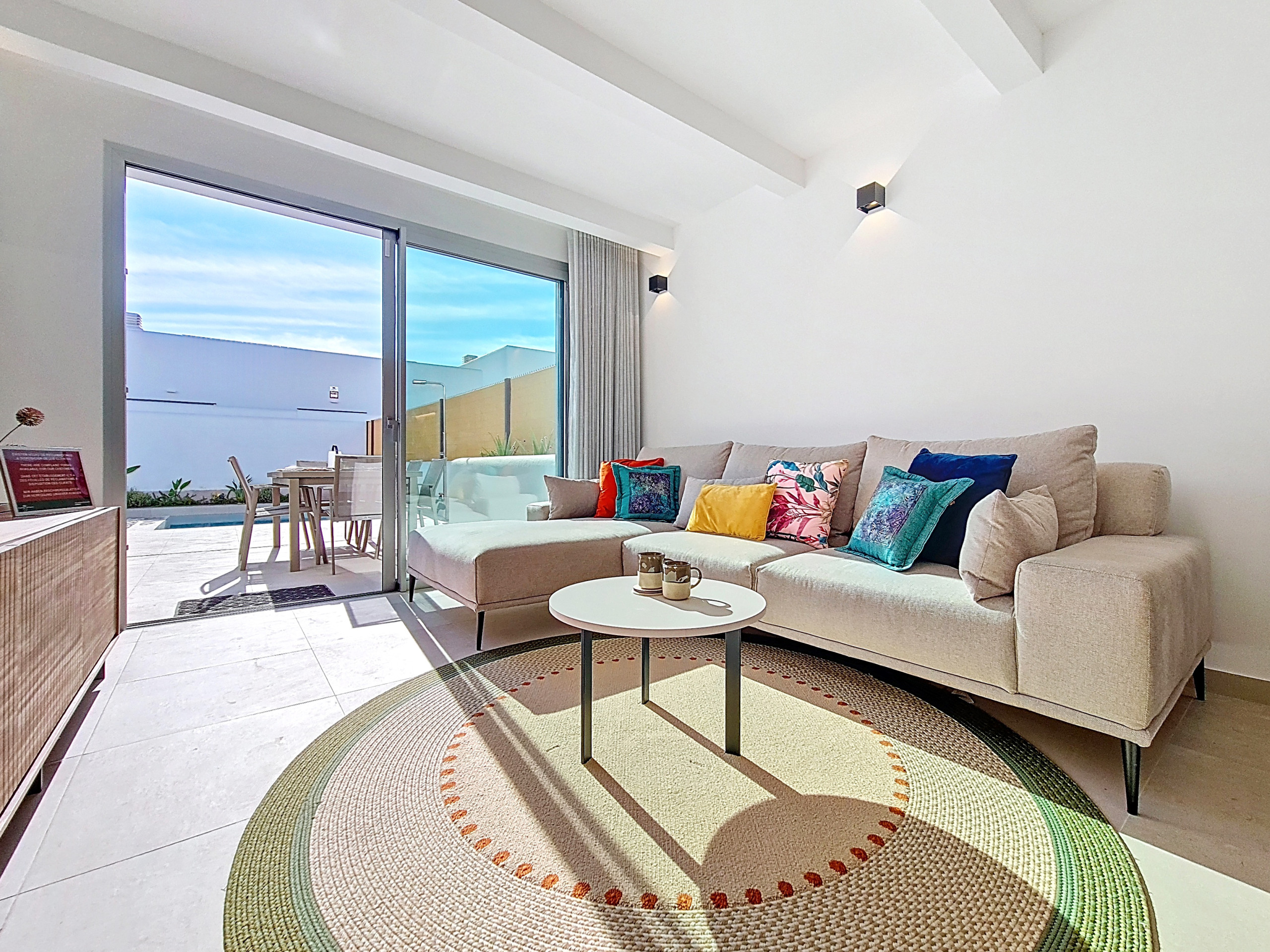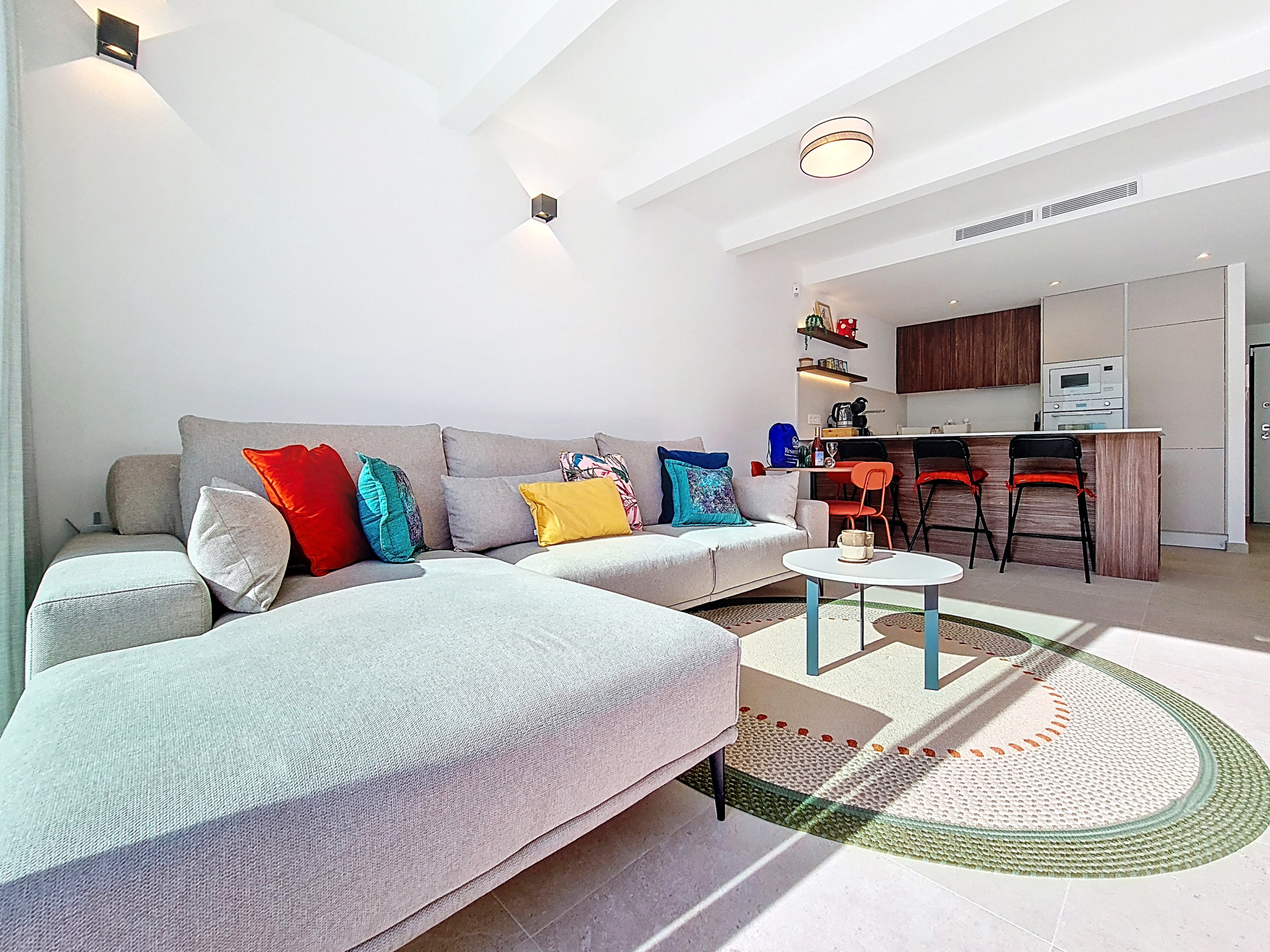 De open woonruimte is licht en uitnodigend en beschikt over een volledig uitgeruste keuken met een ontbijtbar, een kleine eettafel en een ruime zithoek met een grote smart-tv. Zachte, warme kleuren in het interieur creëren een gastvrije sfeer. Een aparte bijkeuken is voorzien van een wasmachine voor extra gemak. Grote schuifdeuren laten veel natuurlijk licht binnen en geven direct toegang tot de privétuin en het zwembad.