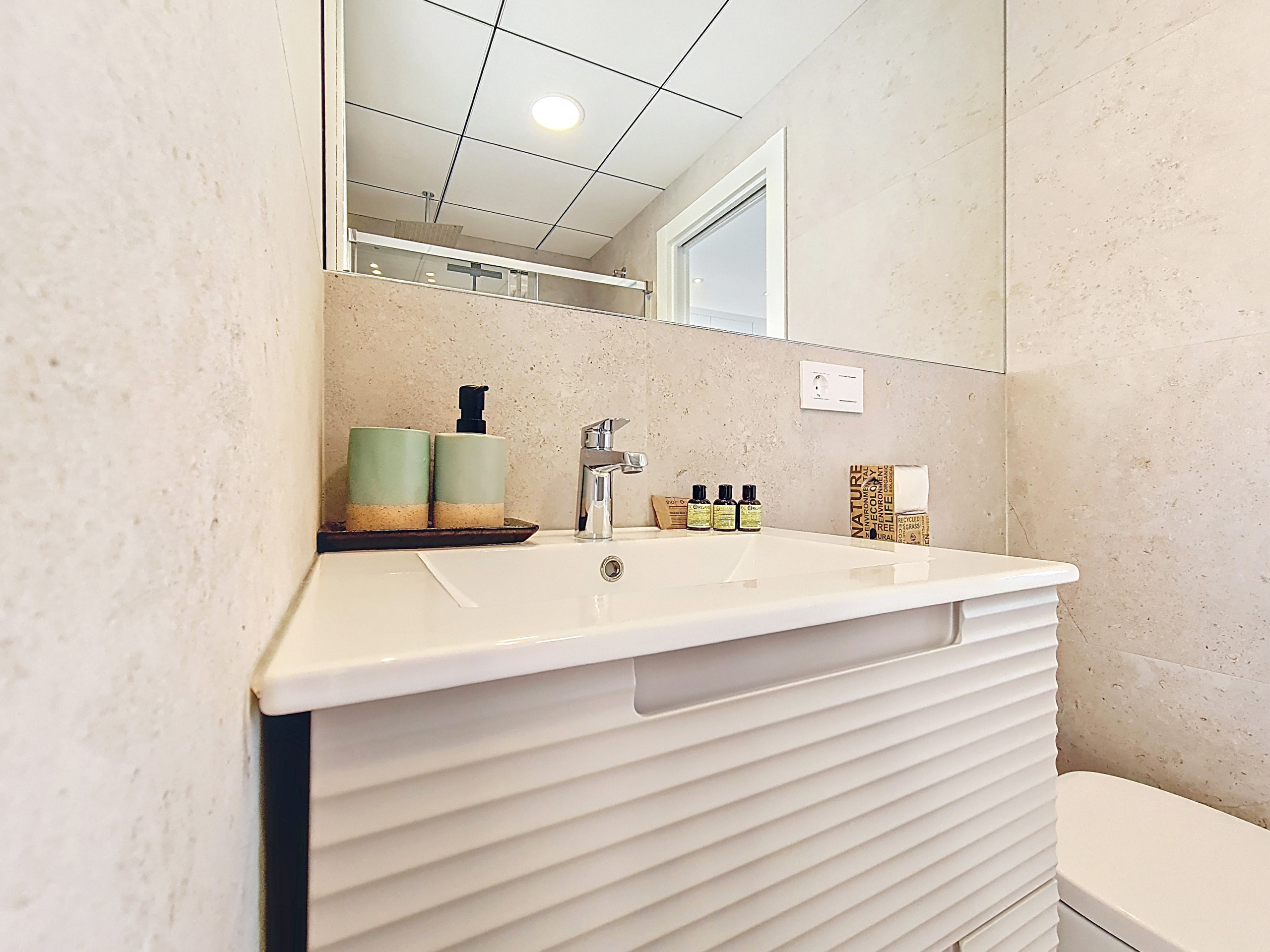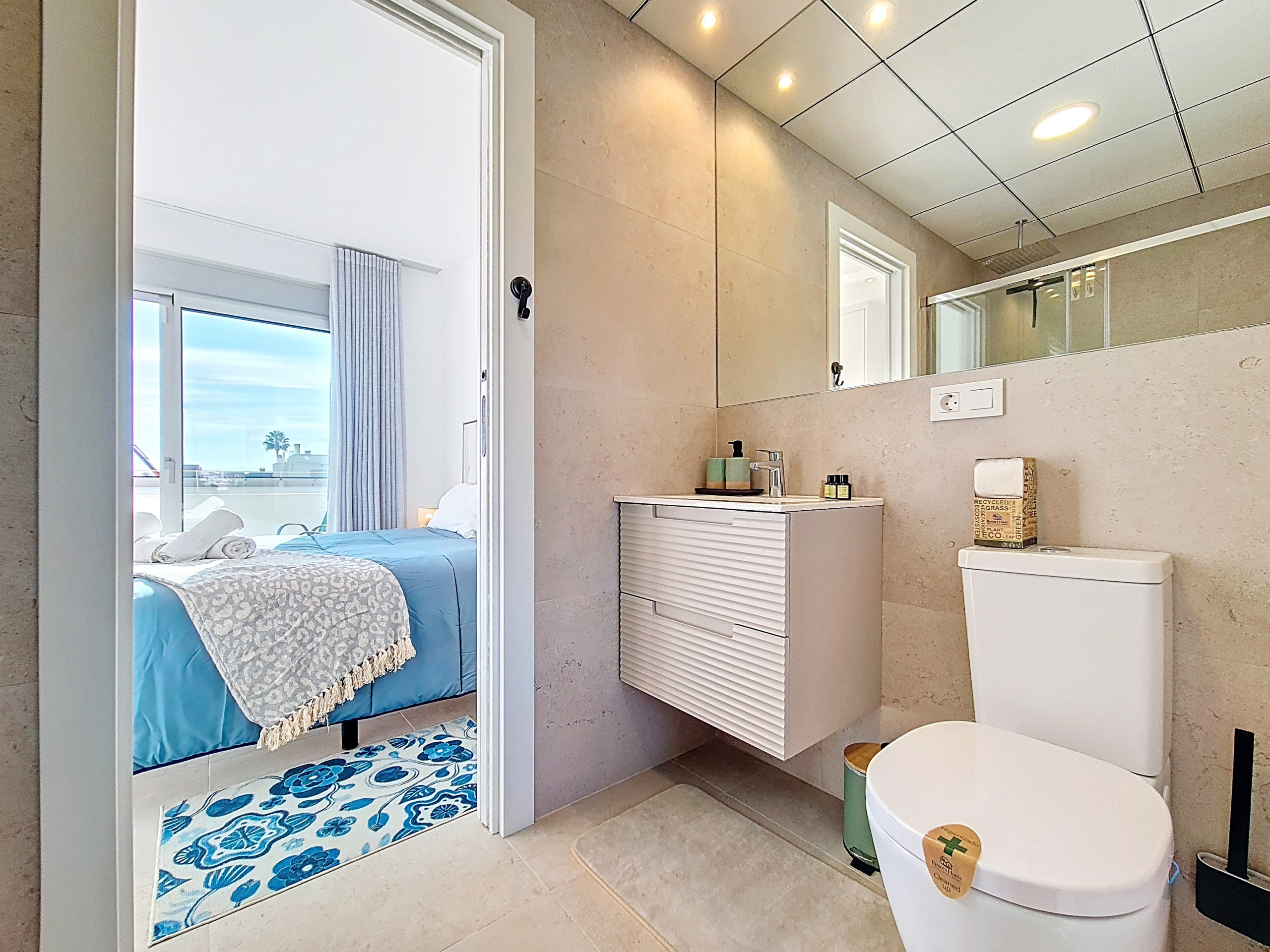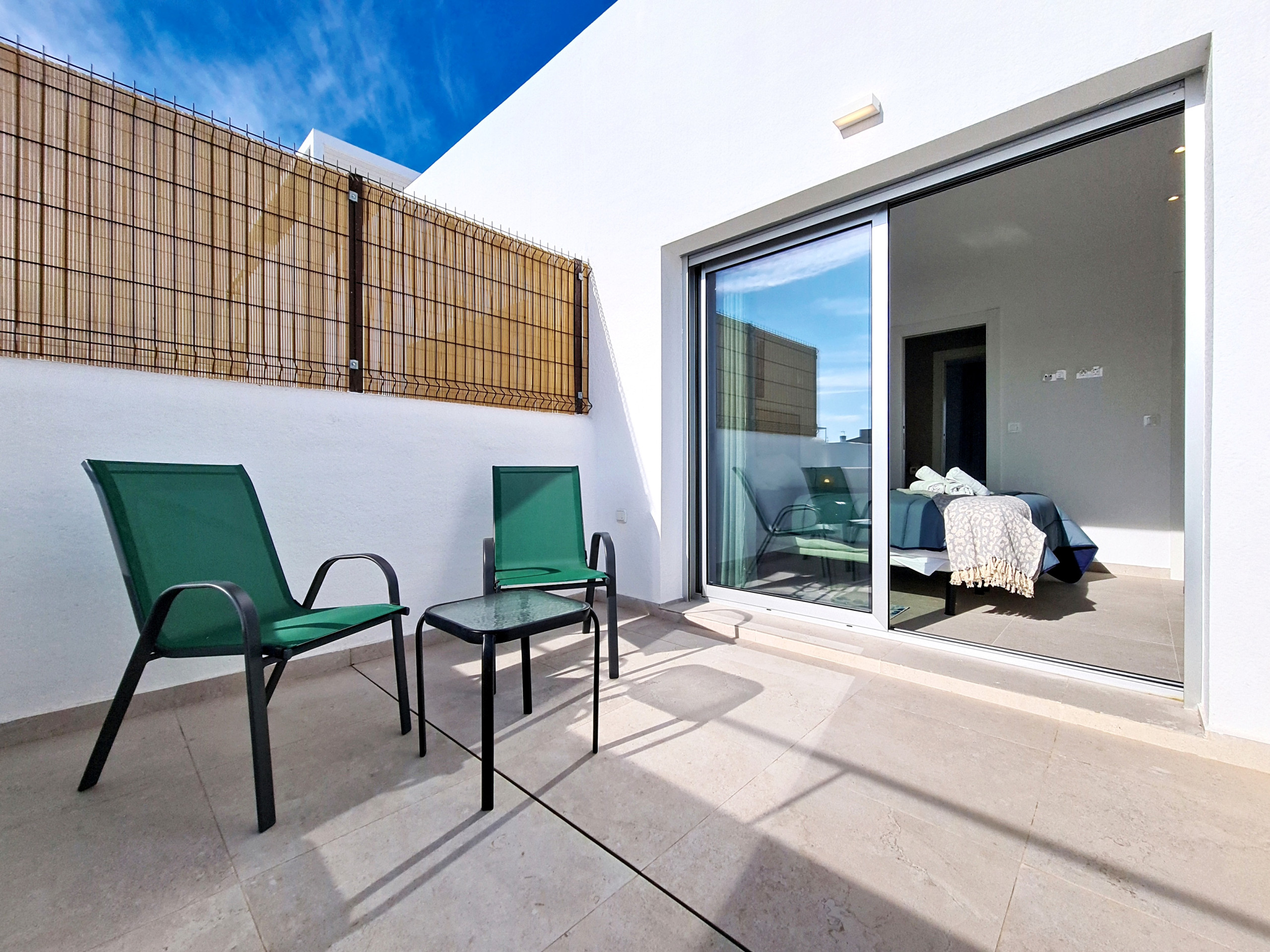 De hoofdslaapkamer bevindt zich op de begane grond, naast een moderne en-suite badkamer met inloopdouche en toegang vanuit de hal, waardoor deze ideaal is voor gasten van alle leeftijden. Boven vindt u nog twee slaapkamers, elk met toegang tot een gedeelde badkamer met inloopdouche en schuifdeuren die vanuit beide slaapkamers openen. De twee slaapkamers boven hebben ook een eigen balkon, elk ingericht met een klein salontafeltje en stoelen. De slaapkamers zijn smaakvol ingericht met warme accenten, wat zorgt voor een gastvrije en ontspannen sfeer.