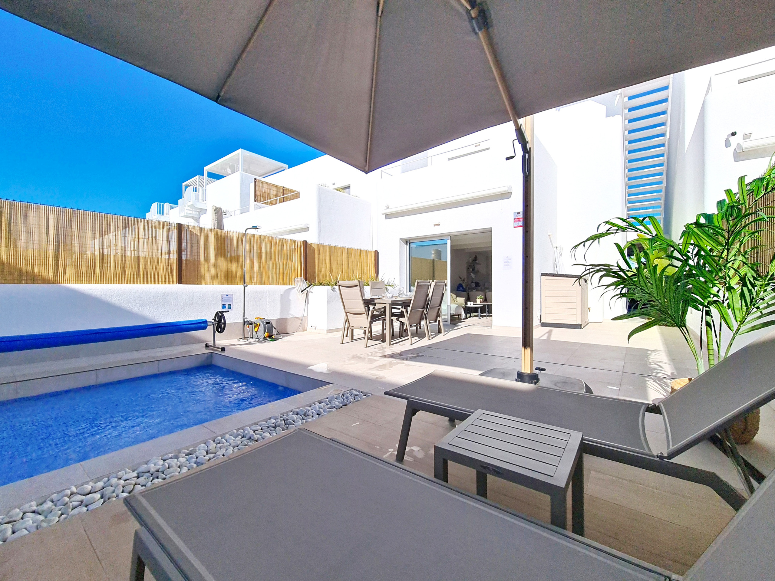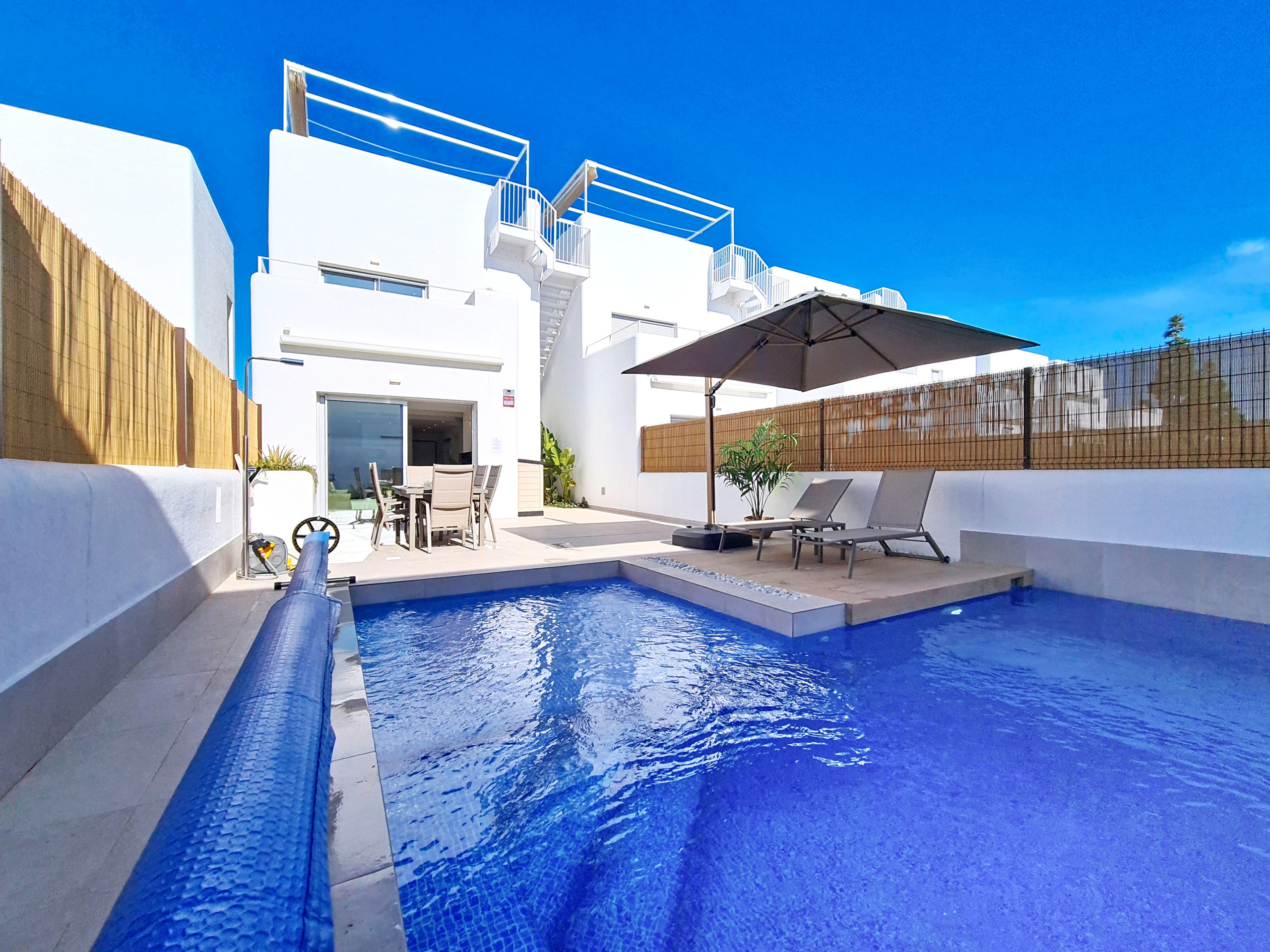Deze villa is gelegen in een populaire wijk van Los Alcazares en op loopafstand van het strand, bars, restaurants en winkels. De woning heeft een open woonkeuken, 3 slaapkamers en 2 badkamers. Het pand heeft grote buitenruimtes met een eethoek die uitkomt op het zwembad, een terras vanuit de grote slaapkamer en een dakterras met relaxbanken met pergola. Binnen in de villa heb je een lounge de grote tv met zenders van over de hele wereld. Wifi internet wordt gratis verstrekt. Er is een ruime keuken met eethoek en een eigen parkeerplaats in de ondergrondse garage.