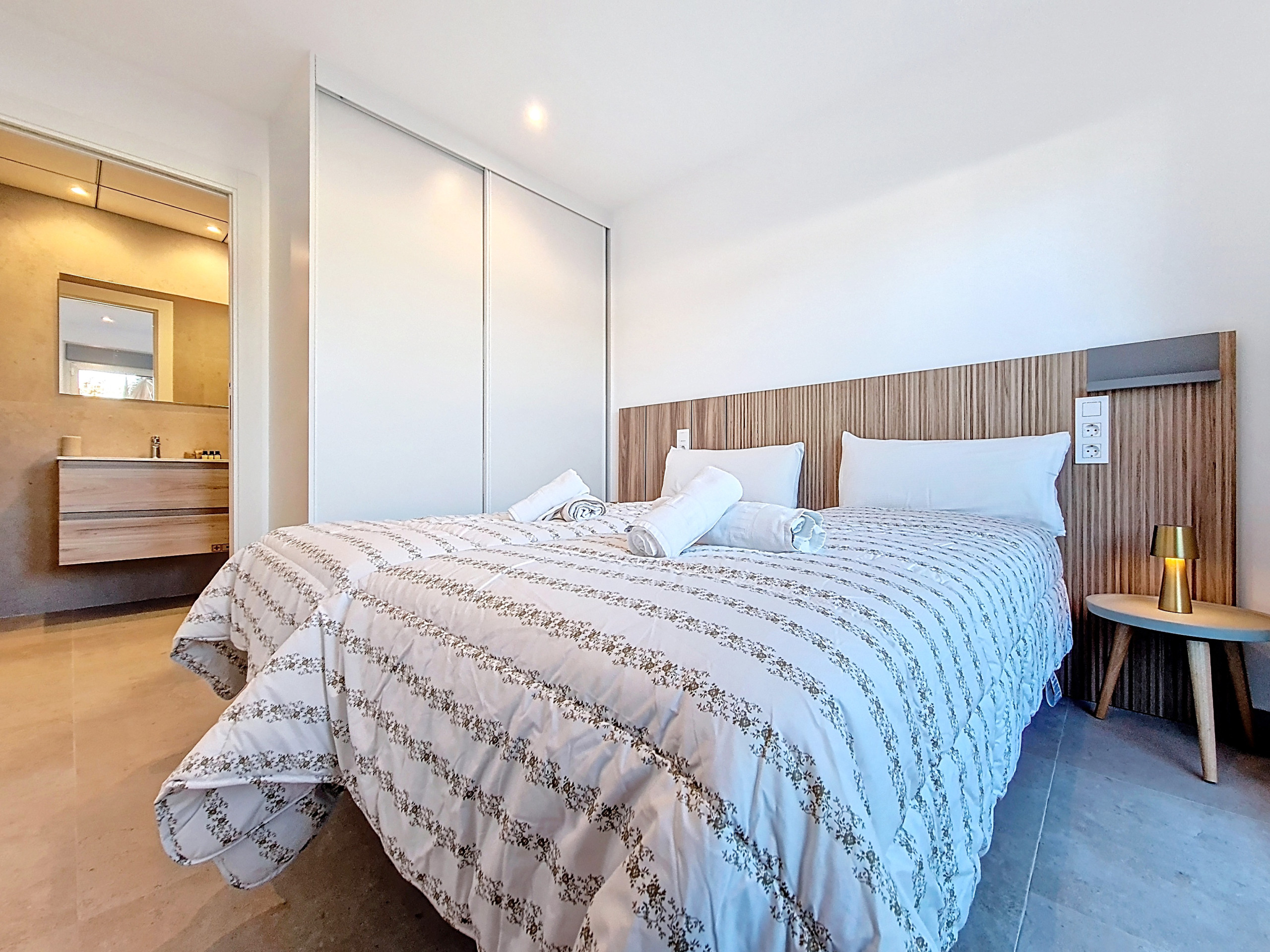 De villa's 3 slaapkamers zijn zorgvuldig ontworpen. Op de begane grond heeft de slaapkamer direct toegang tot een badkamer, die ook een aparte ingang heeft vanuit de hal. Deze slimme indeling maakt het mogelijk dat de badkamer zowel als een privé-ensuite als de hoofdbadkamer op de begane grond van de villa fungeert.
