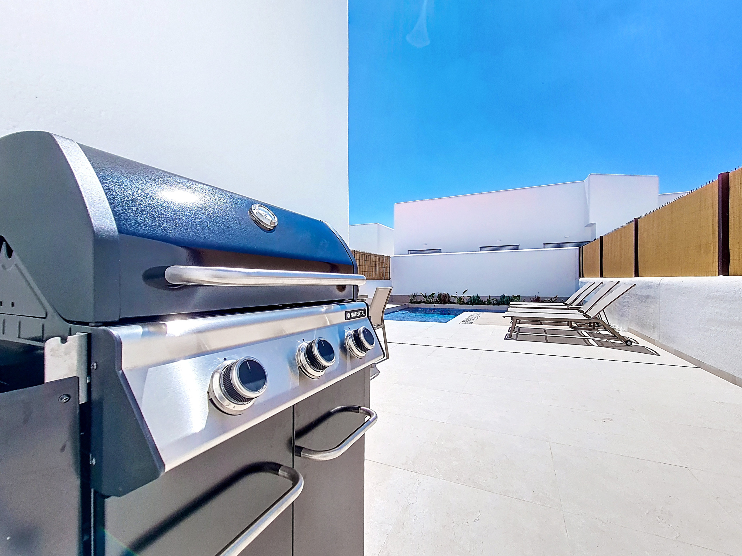 Buiten wordt het L-vormige privézwembad omlijst door een moderne tuin met comfortabele ligstoelen en een eethoek, ideaal voor maaltijden bij het zwembad. Er is ook een barbecue beschikbaar, waardoor avonden in de buitenlucht eenvoudig en aangenaam zijn. Het ruime terras creëert een uitnodigende setting voor zowel rustige momenten als stijlvol entertainment. Parkeren op eigen terrein aan de voorkant van het huis biedt extra gemak.