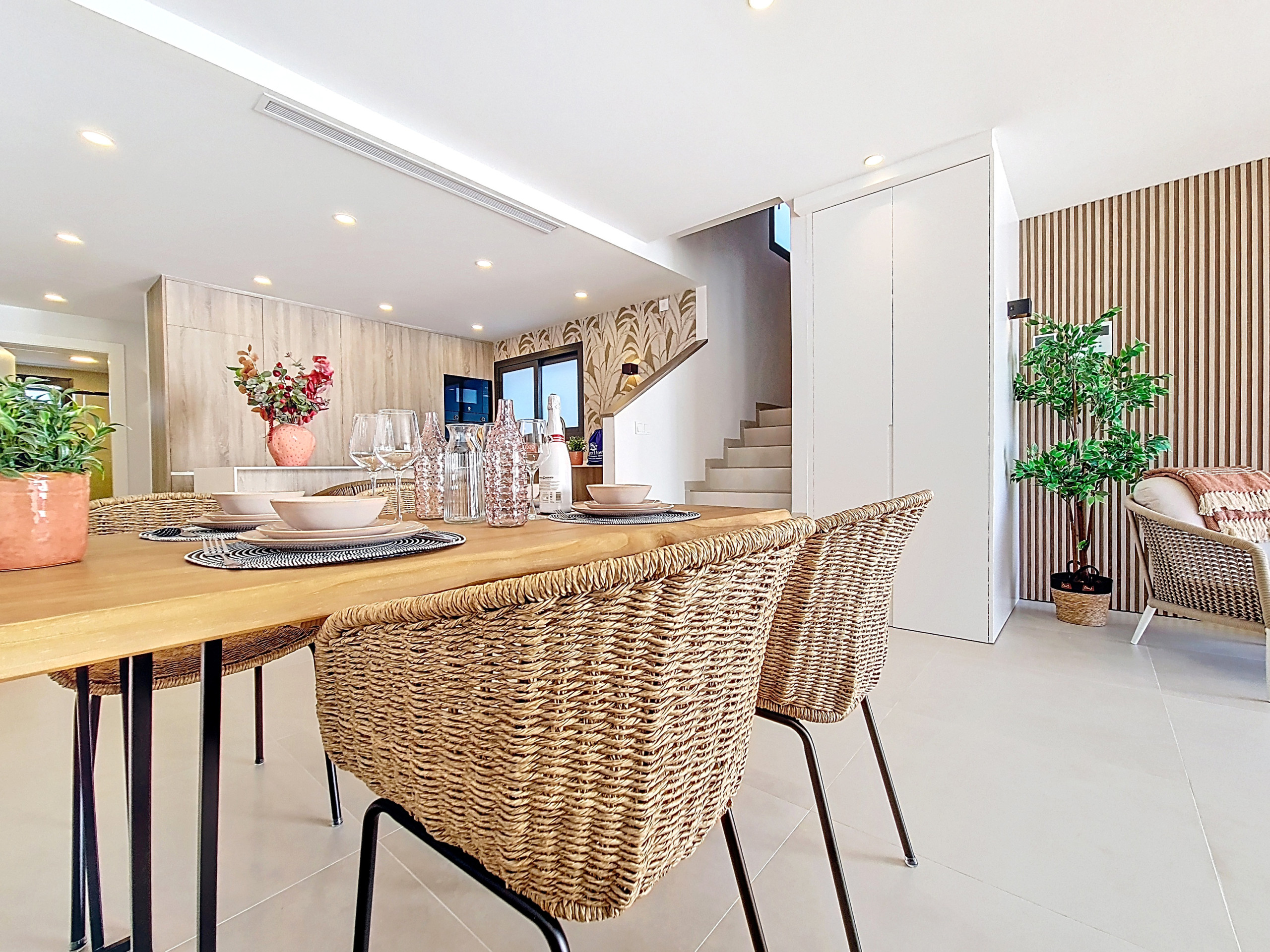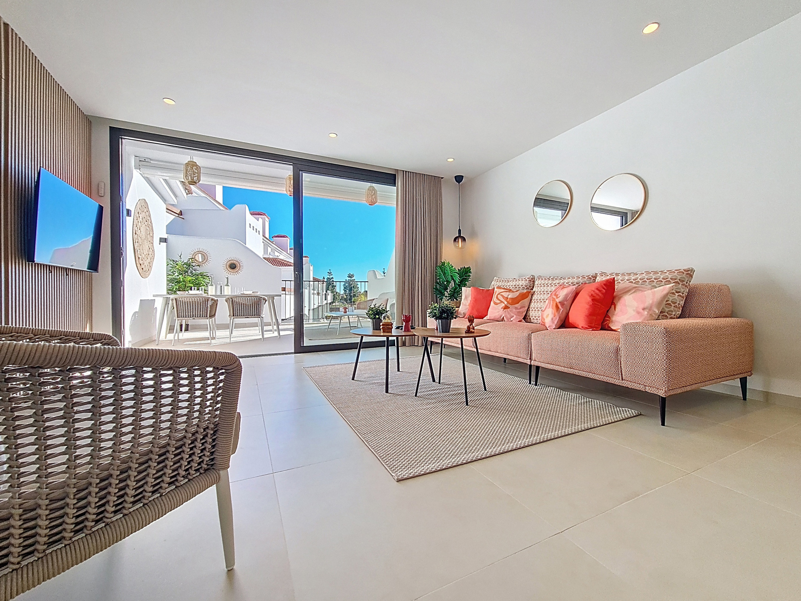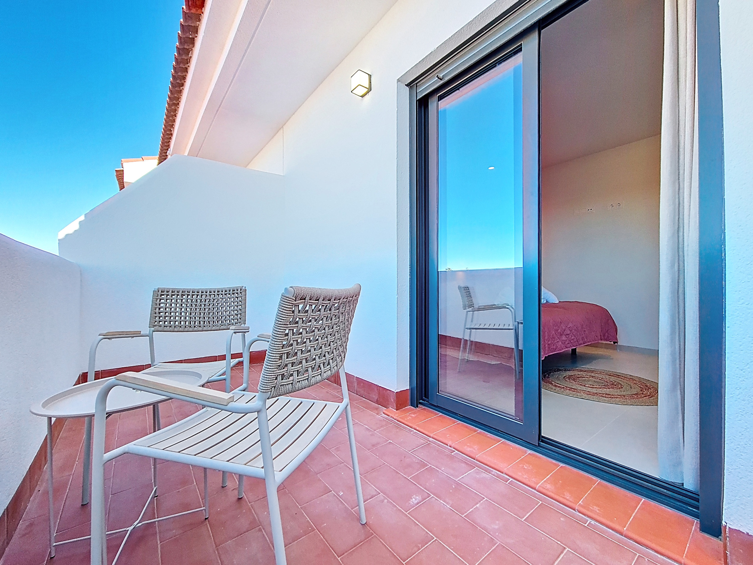 A confortável área da sala de estar tem portas deslizantes que se abrem para o pequeno mas encantador pátio. Esta área exterior privada é um ótimo lugar para relaxar, tem uma mesa e cadeiras modernas que acomodam confortavelmente 4 pessoas. O apartamento fica apenas a dois minutos a pé da deslumbrante praia onde pode desfrutar do sol, do mar e da areia como desejar.