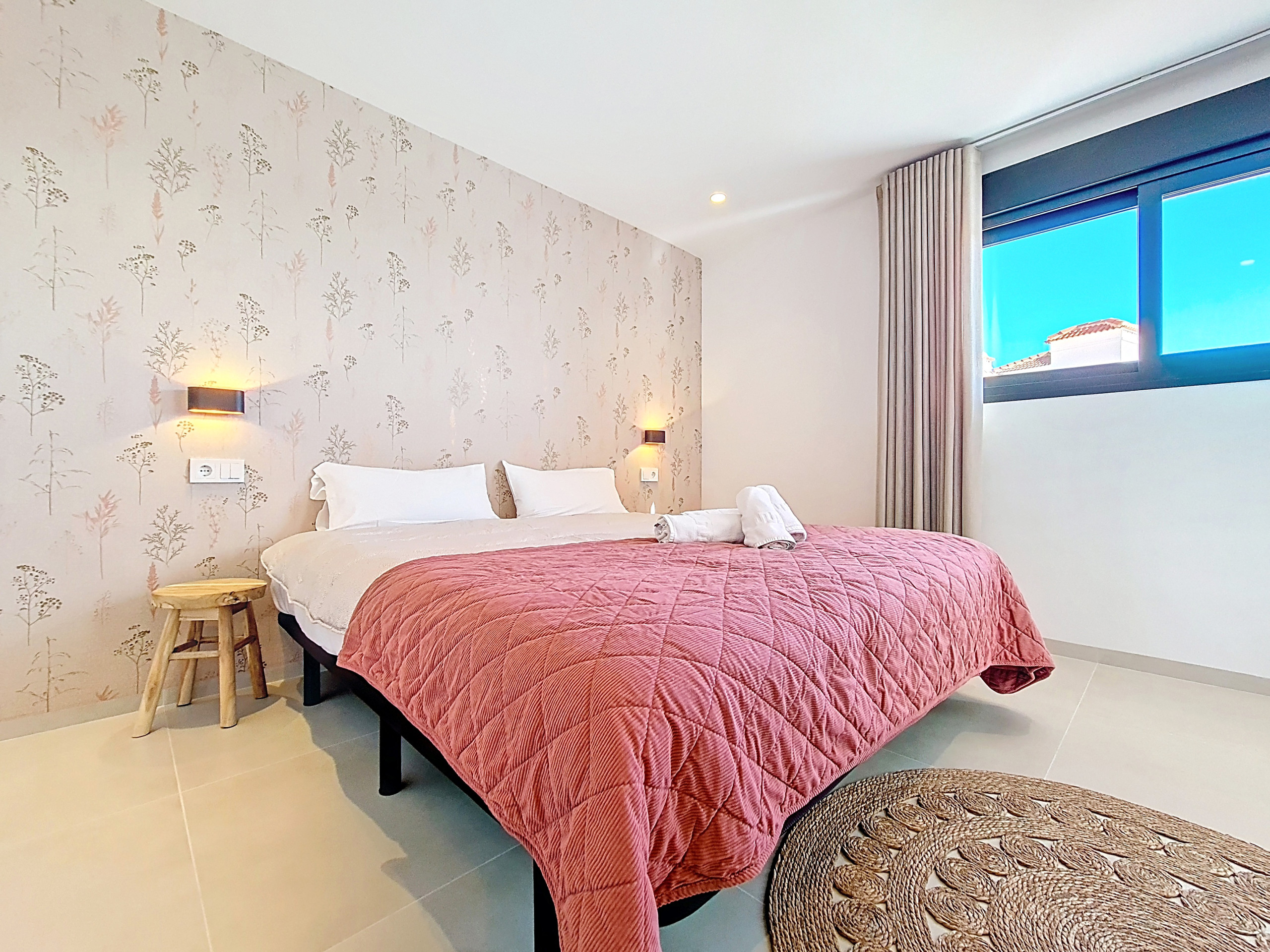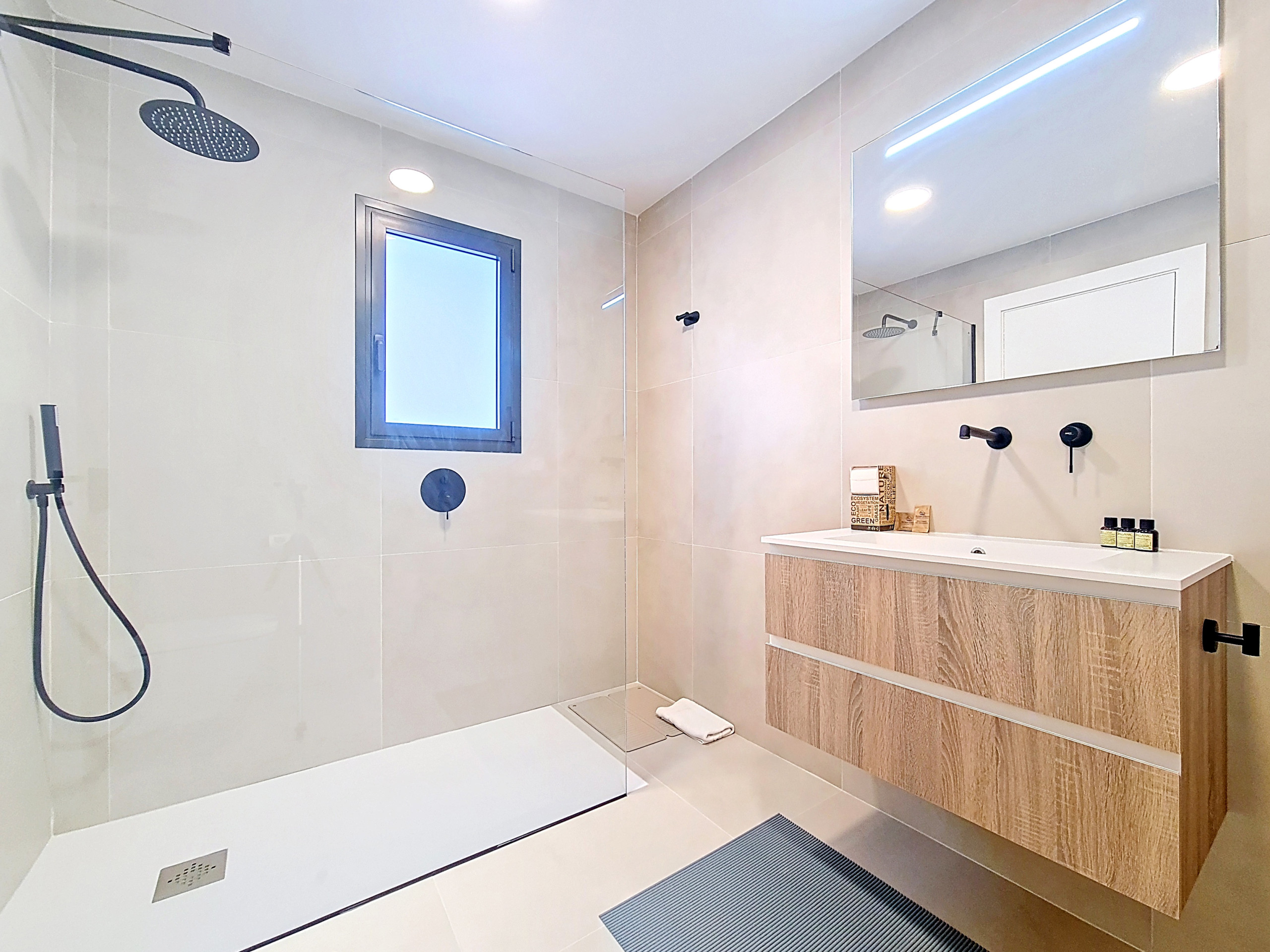 Neste piso, encontra-se um amplo quarto com varanda privada, mobilado com duas confortáveis poltronas e uma pequena mesa. Uma casa de banho moderna separada, com chuveiro, também está localizada no rés-do-chão. O segundo piso dispõe de mais dois quartos espaçosos, um dos quais com casa de banho privativa. Cada quarto tem uma varanda privada com mesa e cadeiras – o local perfeito para um pequeno-almoço ou uma bebida ao final da tarde. Todos os três quartos possuem roupeiros amplos e mobiliário de alta qualidade que confere ao apartamento um ambiente luxuoso e acolhedor.