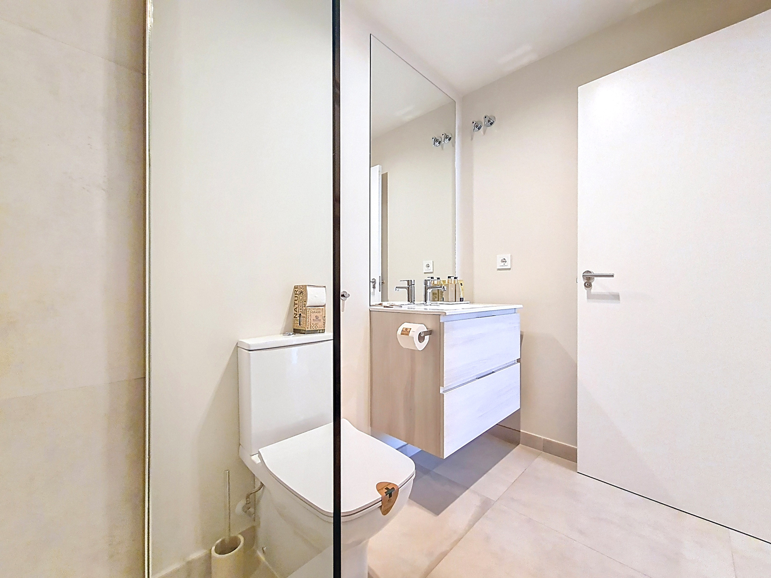 O quarto principal oferece uma casa de banho privativa e um closet, criando um retiro privado. O segundo quarto inclui roupeiros embutidos e é servido por uma casa de banho moderna separada, tornando-o ideal para hóspedes ou família. Ambos os quartos são projetados para o conforto, com iluminação suave e uma atmosfera serena.