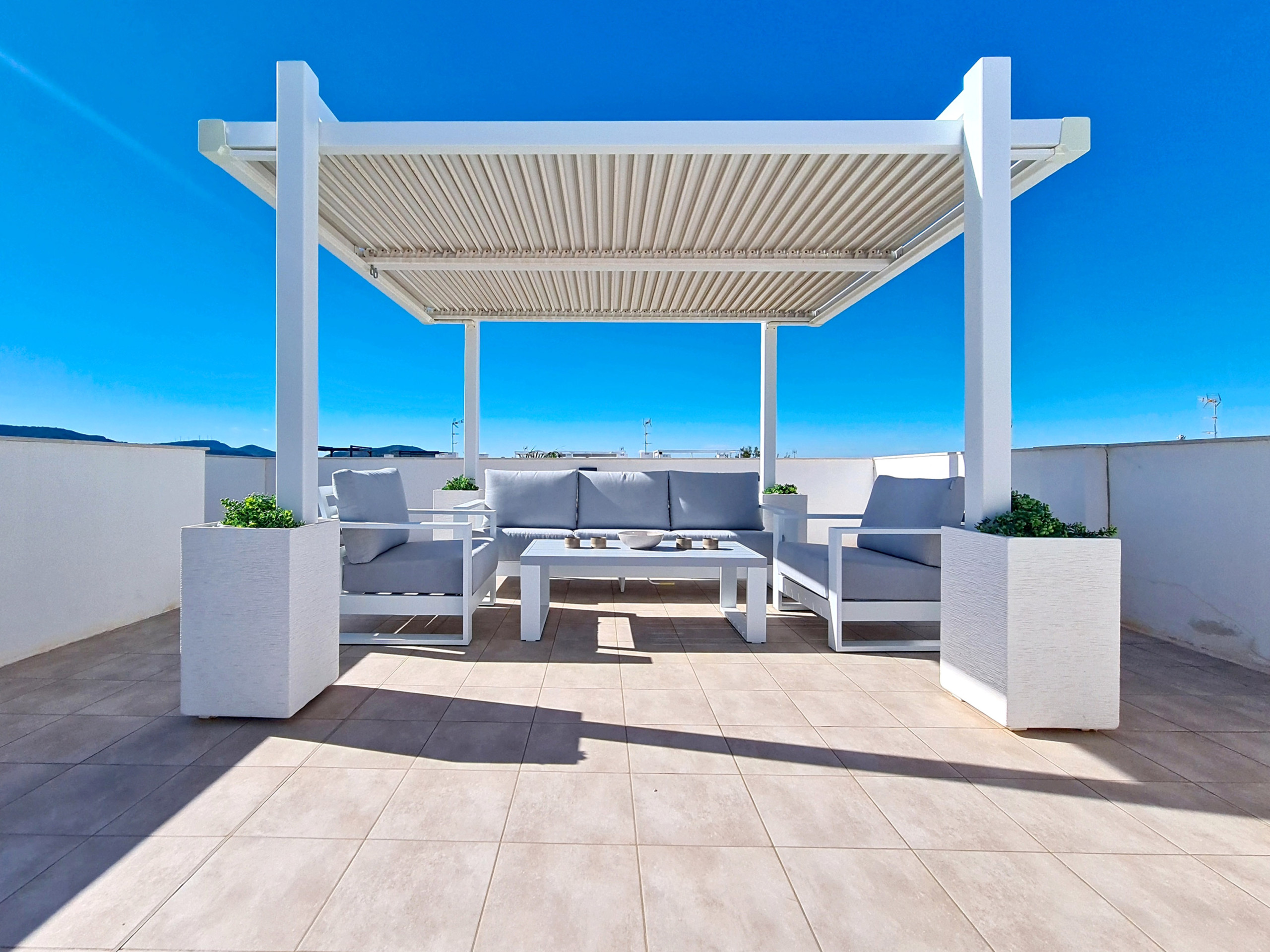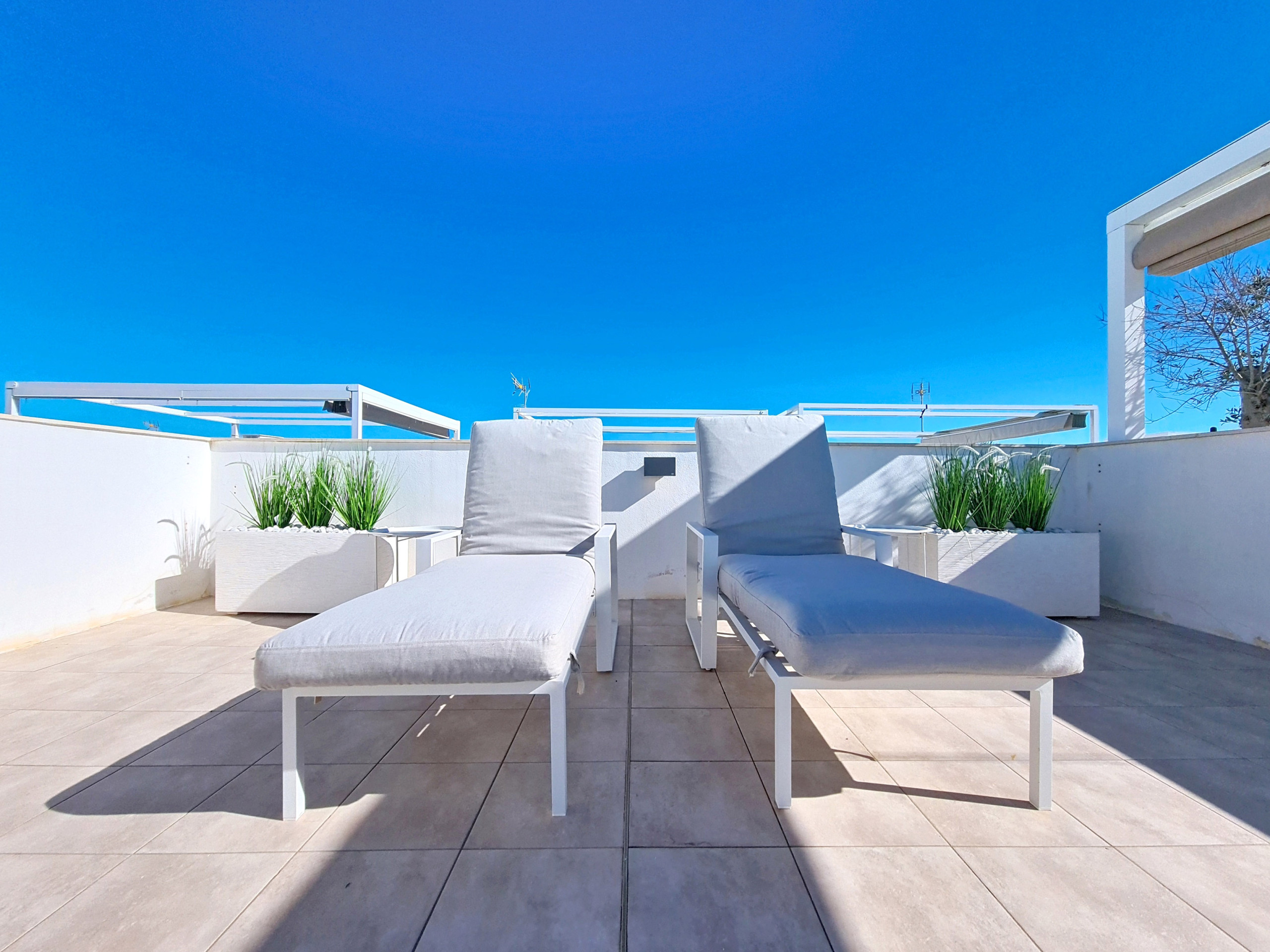 Uma característica marcante deste penthouse é o terraço privado e espaçoso no telhado. Este espaço versátil inclui espreguiçadeiras e uma área de estar confortável, perfeita para bebidas ou simplesmente desfrutar de vistas panorâmicas do Mar Menor e das montanhas circundantes.