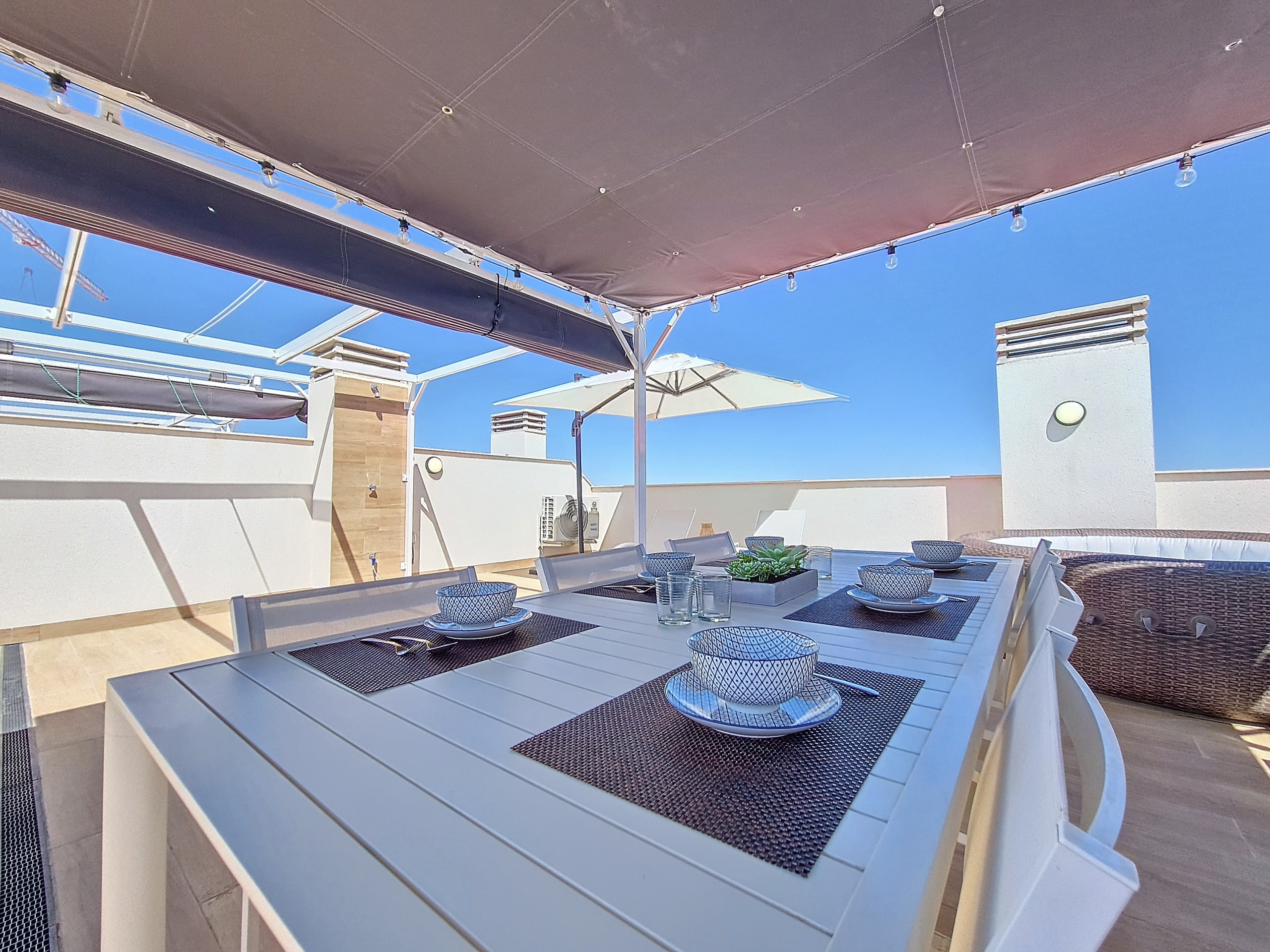 O apartamento dispõe de um espaçoso terraço privativo com jacuzzi, área de cozinha, sofás relaxantes, mesa de jantar, espreguiçadeiras e cadeiras com guarda-sol.