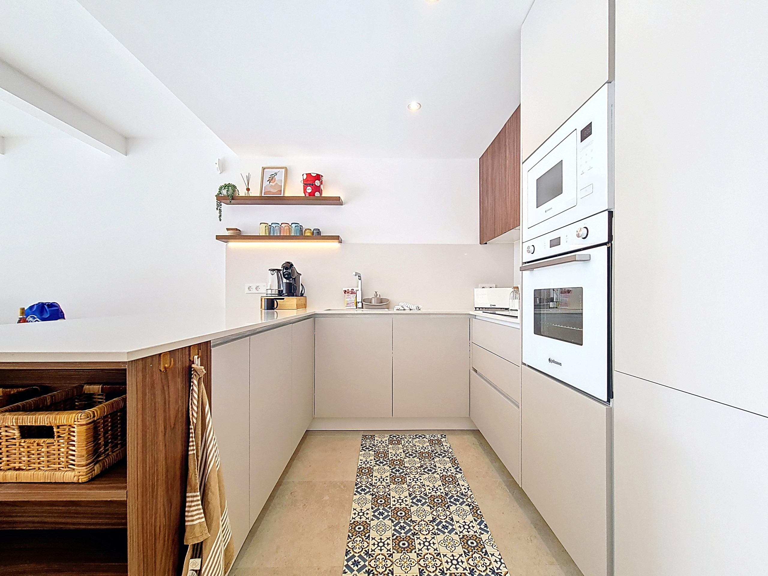 A luminosa e convidativa área de estar em plano aberto inclui uma cozinha totalmente equipada com um balcão para refeições rápidas, uma pequena mesa de refeições e uma espaçosa sala de estar com uma grande smart TV. Tons suaves e quentes caracterizam o interior, criando uma atmosfera acolhedora. Uma lavandaria separada com máquina de lavar roupa proporciona ainda mais comodidade. Grandes portas de vidro deslizantes inundam a propriedade com luz natural e dão acesso direto ao jardim privado e à piscina.
