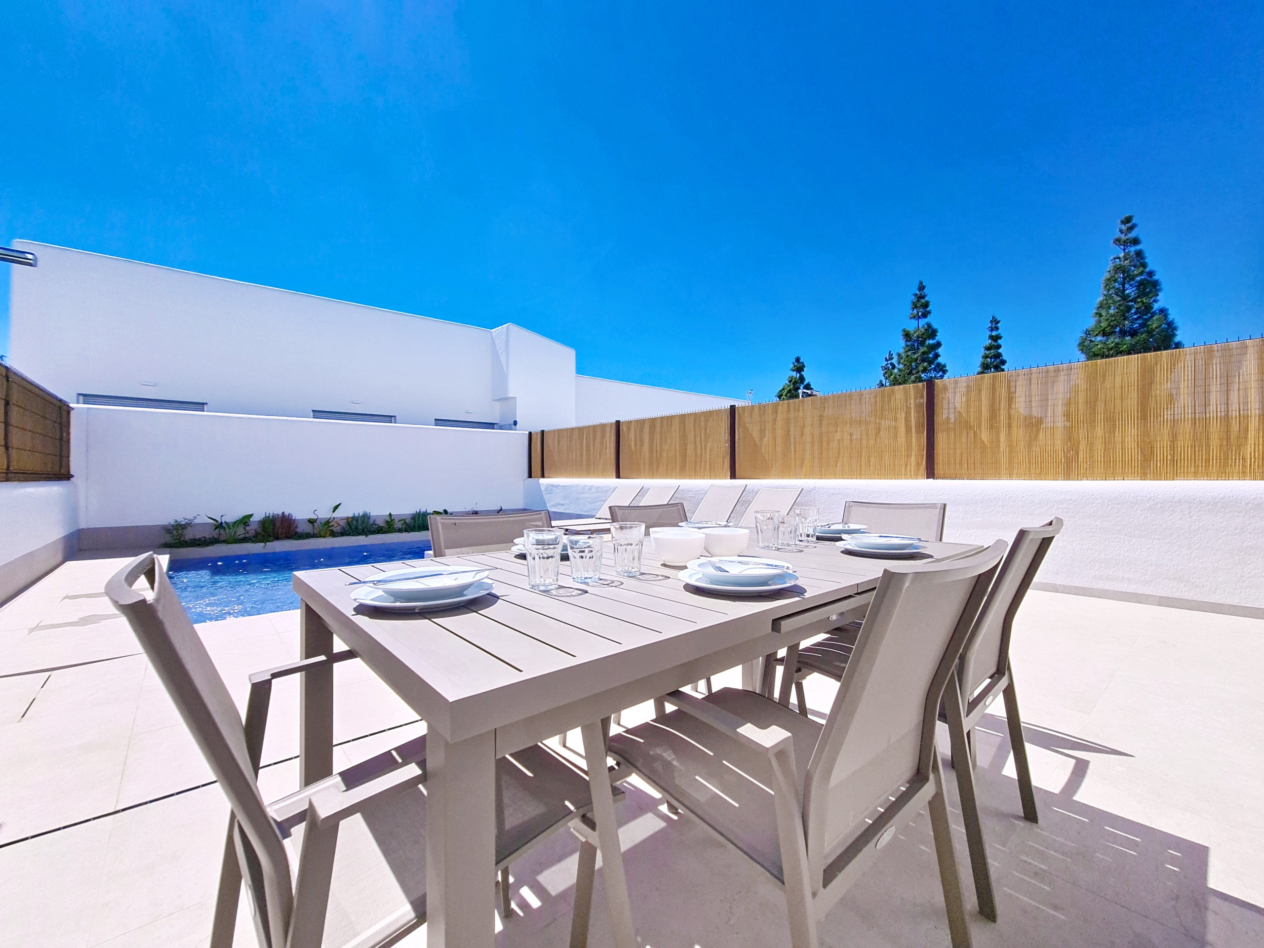 A villa está localizada na popular área de Los Alcázares, a poucos passos da praia, bares, restaurantes e lojas. Há uma grande área para refeições ao ar livre com vista para a piscina, um terraço ao ar livre no quarto principal no andar de cima e um terraço na cobertura com sofás e um gazebo. Dentro da villa você encontrará uma espaçosa sala de estar em plano aberto, área para refeições e cozinha.