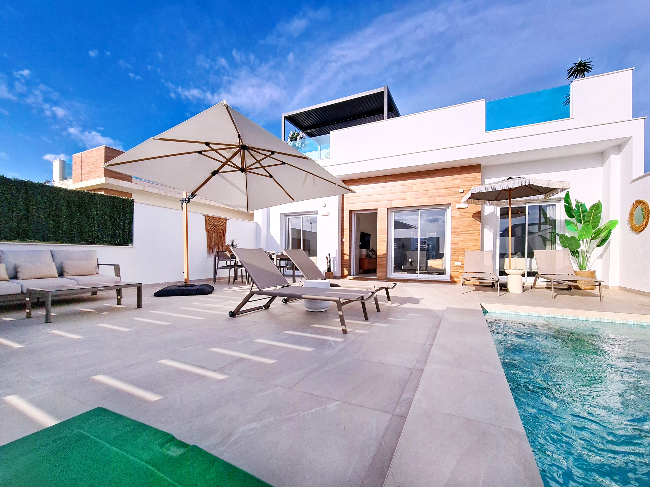No exterior da frente, há um grande terraço com espreguiçadeiras e uma mesa de refeições com cadeiras, oferecendo muito espaço para relaxar, jantar ou apanhar sol junto à piscina. Nas traseiras da villa, um pátio privado proporciona um local mais protegido para desfrutar de um café tranquilo ou uma bebida noturna. Possui uma pequena mesa e cadeiras e é acessível tanto pela área da cozinha como por um dos quartos. A partir daqui, degraus levam diretamente para o espaçoso terraço no telhado.