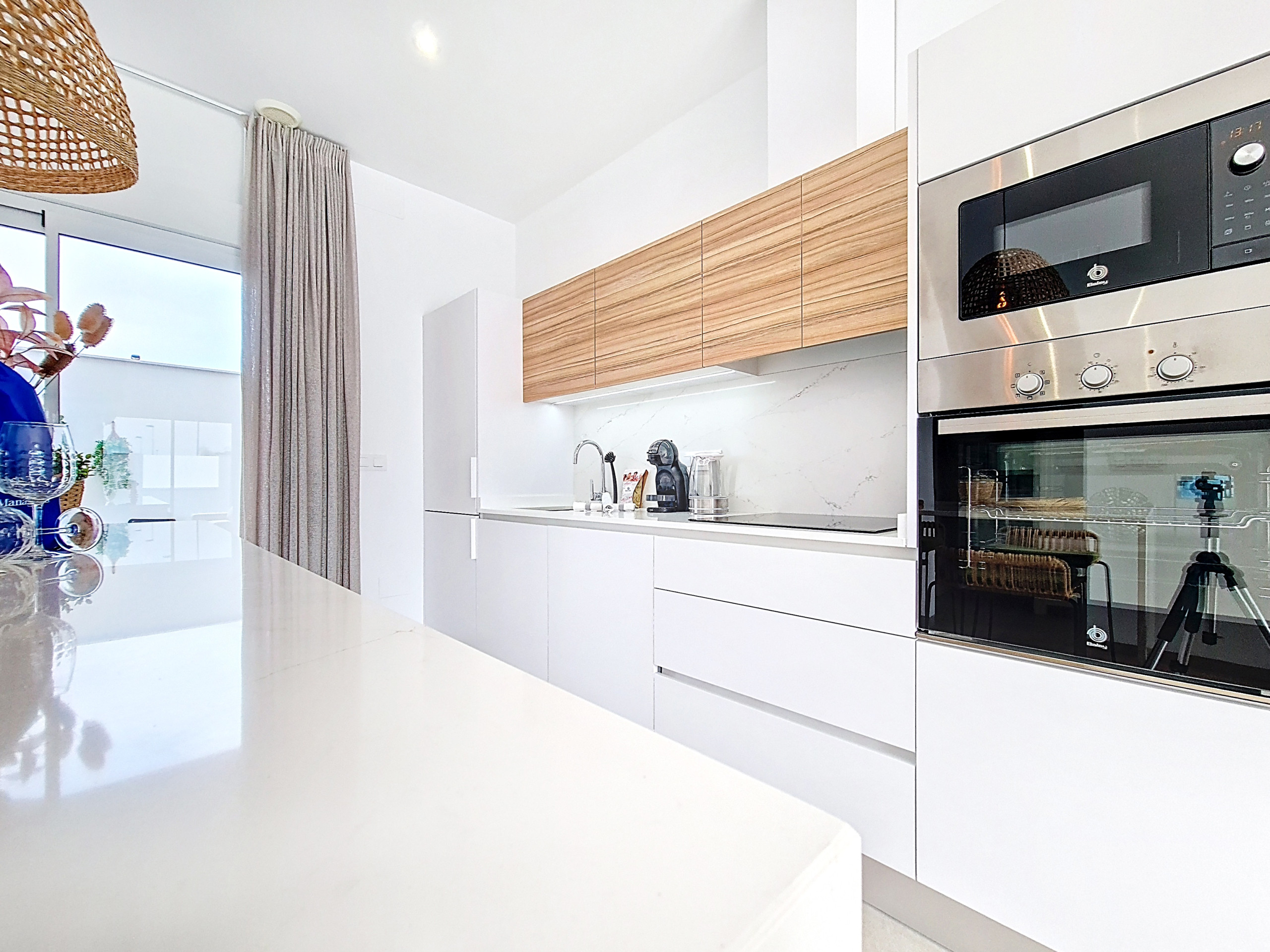 O layout em plano aberto é luminoso e espaçoso, com uma cozinha moderna totalmente equipada que se estende para a sala de jantar e de estar. As portas de vidro deslizantes abrem diretamente para o terraço e piscina privada, criando um espaço interior-exterior ideal para aproveitar o sol.