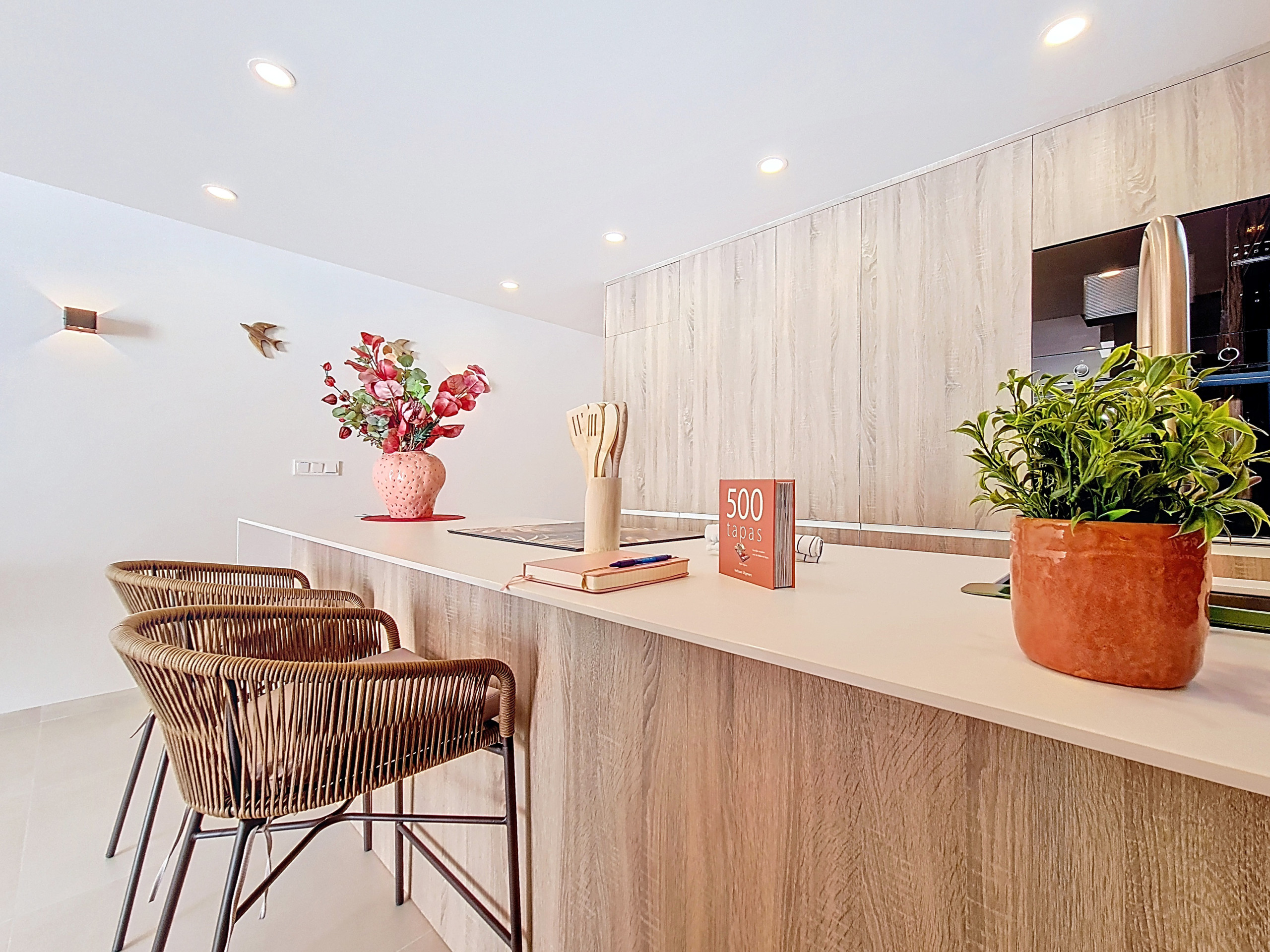 The comfy living room area has sliding patio doors that open out onto the small but charming patio space. This private outdoor area is a great place to relax it has a modern table and chairs that comfortably seats 4. It is a great place to sit and enjoy the Mediterranean sunshine or relax with a drink in the evening. The apartment is just a two-minute walk from the stunning beach where you can enjoy the sun, sea, and sand at your leisure.