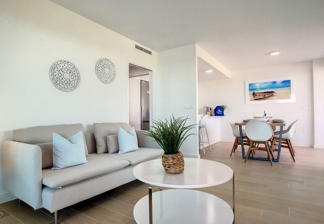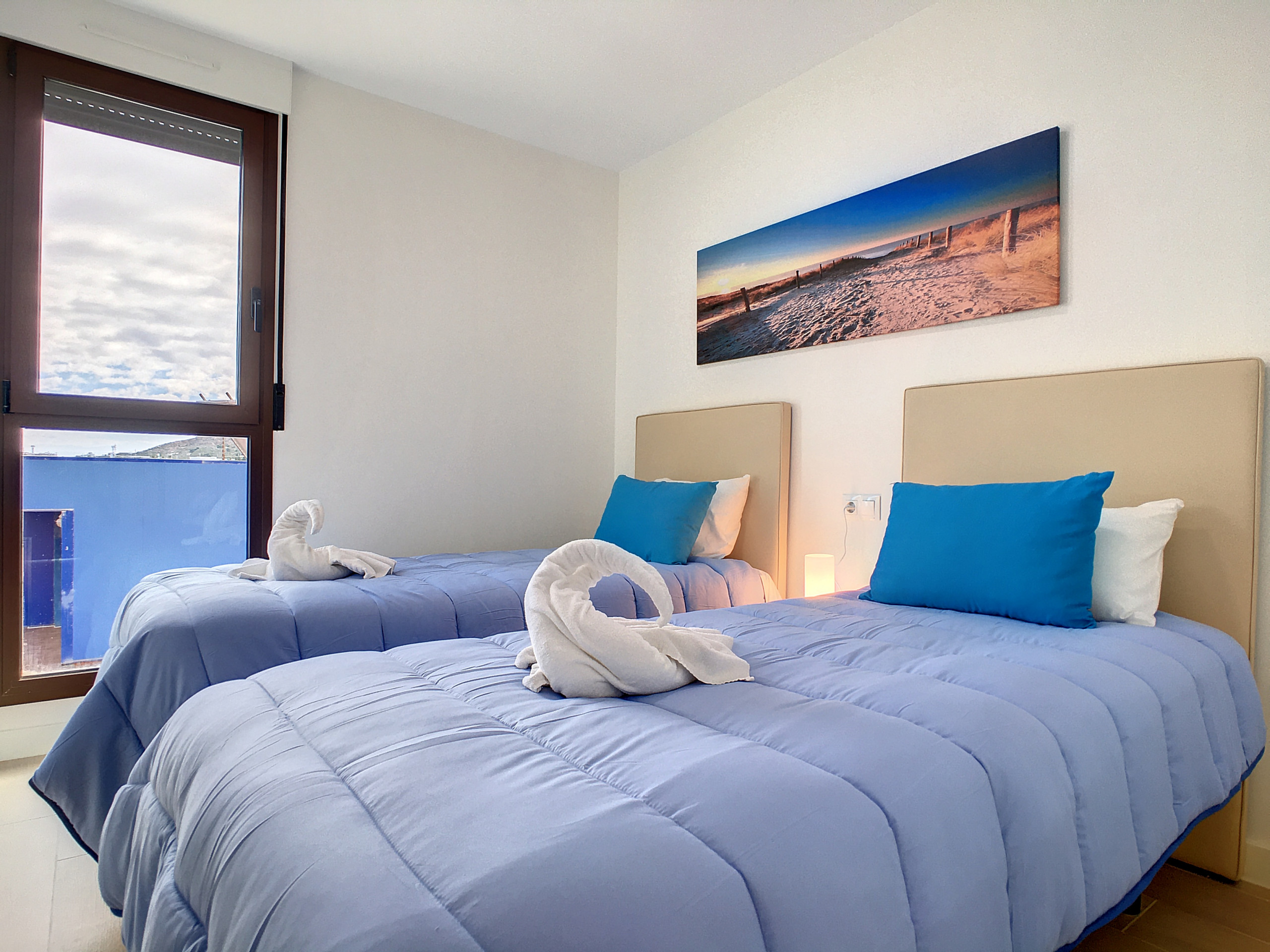 The apartment has fantastic views of the complex, the light house in Cabo de Palos and the sea. There are 3 bedrooms and 2 bathrooms (one en-suite from main bedroom), open-plan living area with kitchen and large glass doors out onto the wrap around terrace where you can enjoy the view, eat out or relax on the sofa. You can also access the terrace from the main bedroom.