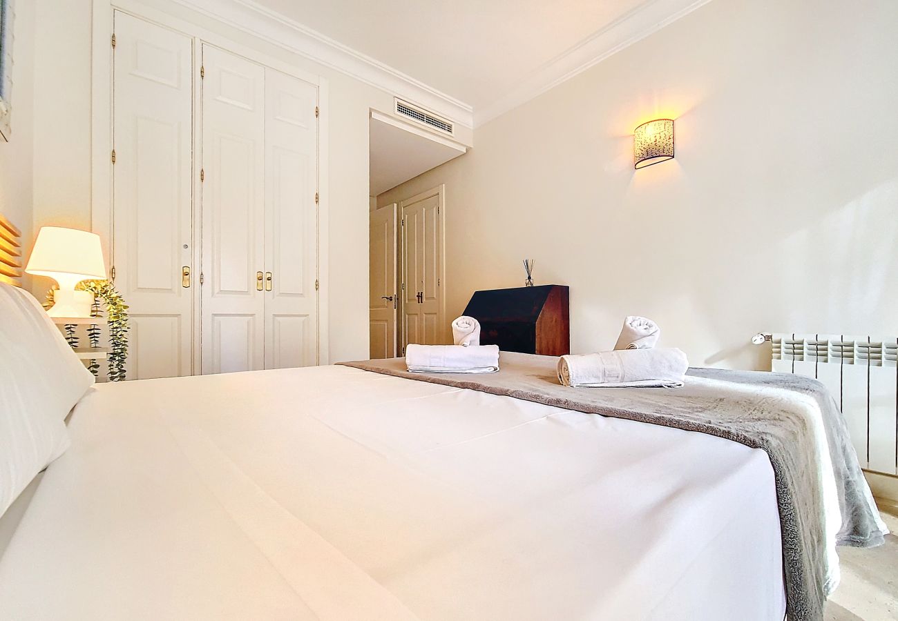 The apartment features two beautifully spacious bedrooms. The master bedroom, with doors that open out onto the patio, is a perfect retreat, complete with a comfortable double bed and built-in wardrobes that offer plenty of storage. The room also has an en-suite bathroom, with a large walk-in shower and modern fixtures. The second bedroom is cozy and perfect for children, friends, or additional guests. It is tastefully furnished with twin beds and is conveniently located adjacent to the second bathroom, which also has a walk-in shower.