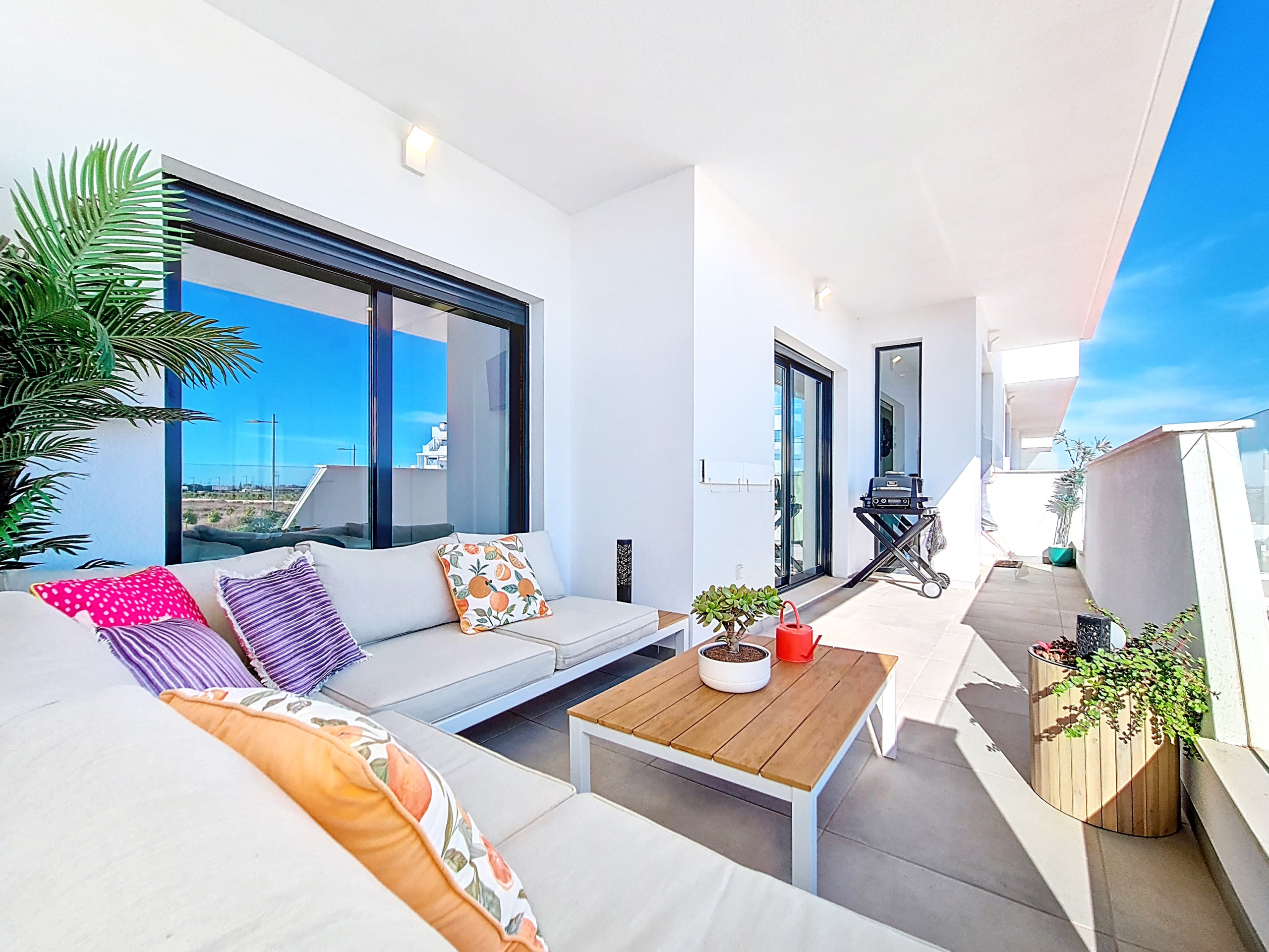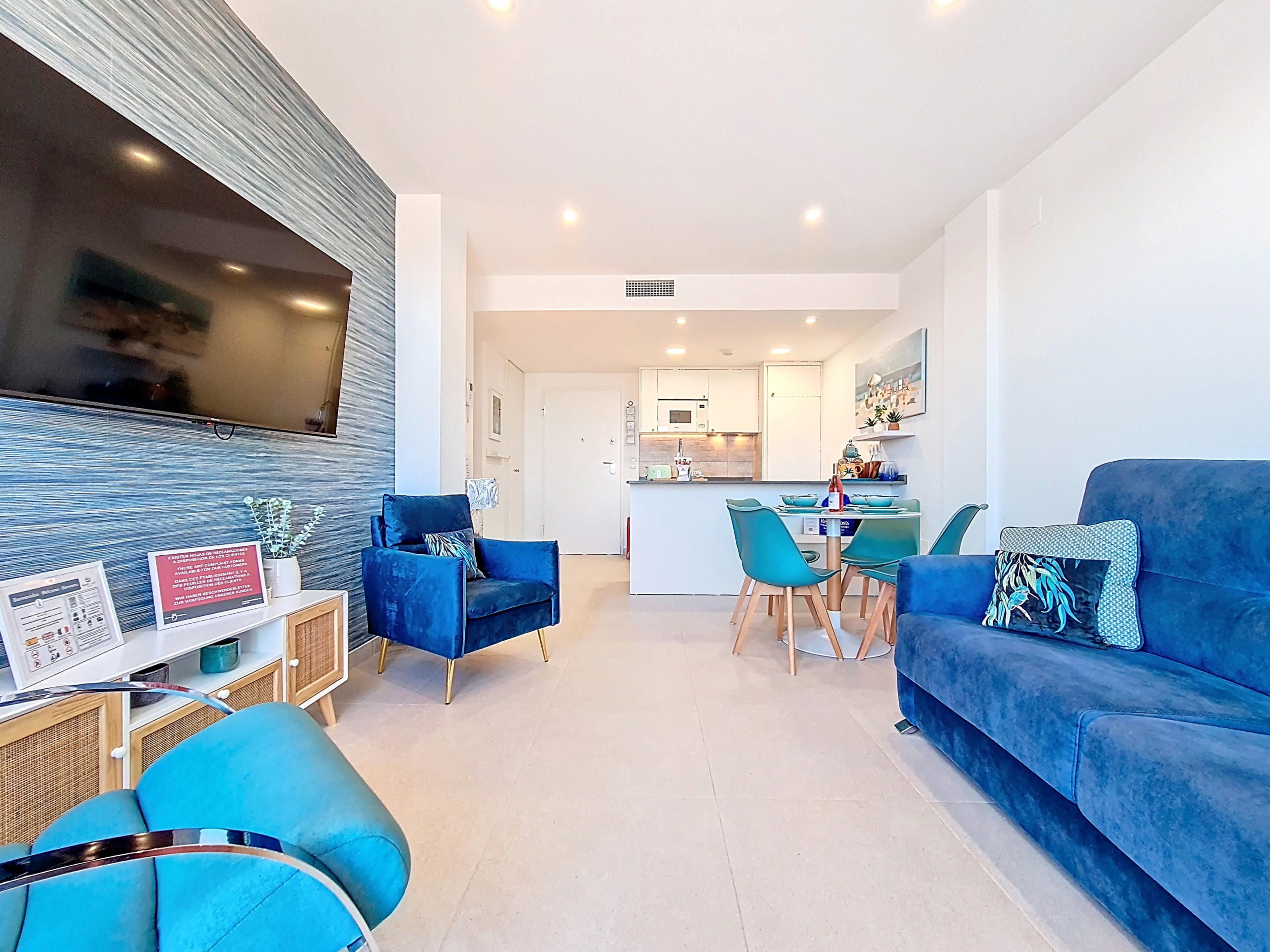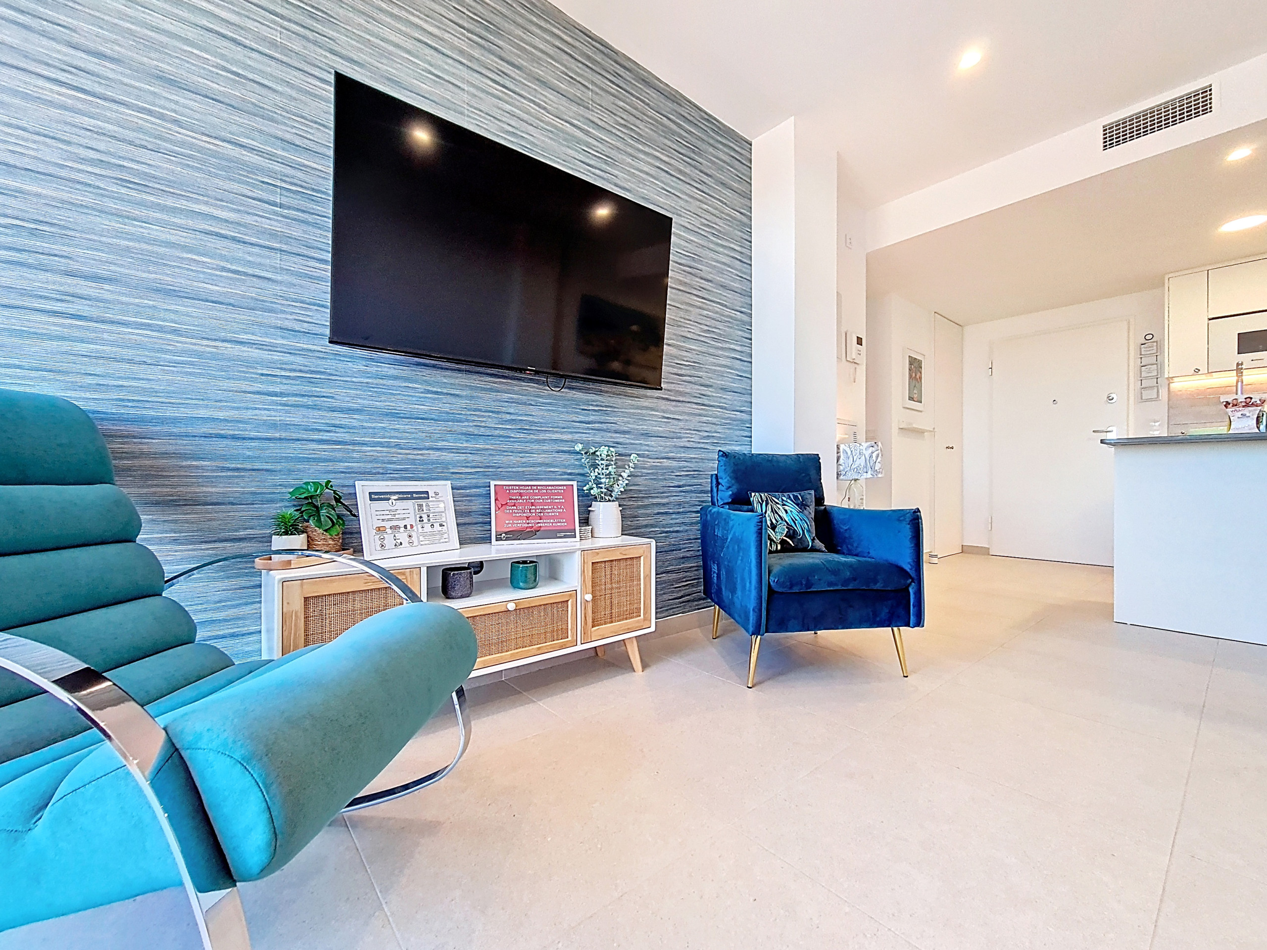 This stylish apartment offers modern comforts like air-conditioning throughout a Smart TV and high-speed Wi-Fi, keeping you cool and connected during your stay. From this apartment, you have access to a beautifully maintained communal pool area, complete with a jacuzzi and a dedicated kids' pool . There is also a small outdoor gym and children’s play area. It's the perfect spot to take a refreshing dip or relax under the warm Mediterranean sun with family and friends.