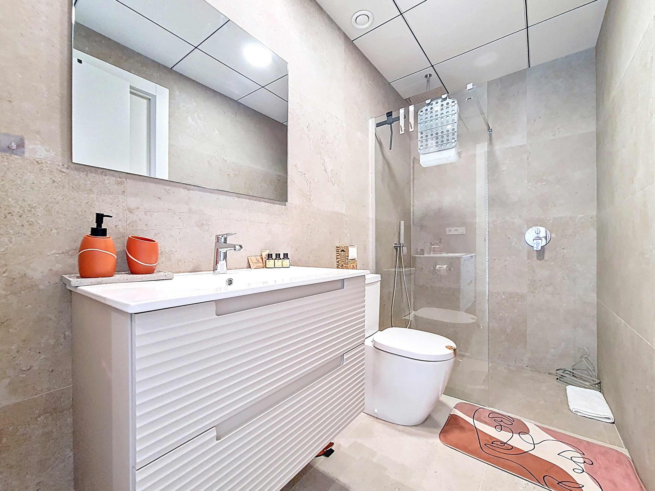 The main bedroom is located on the ground floor and sits next to a modern bathroom with a walk-in shower and access from the hallway, making it ideal for guests of all ages. Upstairs, you’ll find two further bedrooms, each with access to a shared central bathroom featuring another walk-in shower and designed with sliding doors that open from both bedrooms. Both upstairs bedrooms also feature their own private balcony, each furnished with a small coffee table and chairs. The bedrooms are tastefully decorated with warm accents, creating a cosy and relaxing feel.