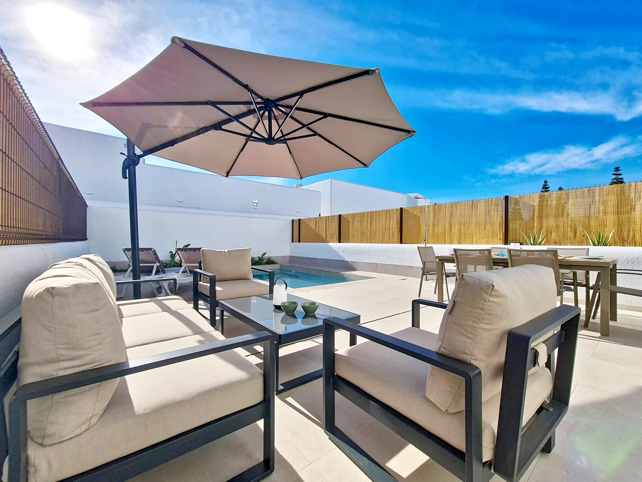 Outside, the L-shaped private pool is framed by a modern garden, with comfortable sun loungers and a dining area that’s ideal for meals by the pool. A BBQ is also available, making alfresco evenings simple and enjoyable. The spacious patio creates an inviting setting for both quiet moments and entertaining in style. Off-street parking at the front of the house adds extra convenience.
