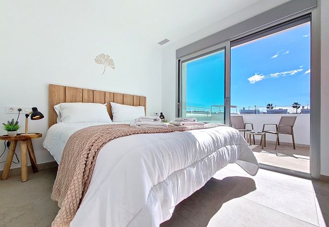 The main bedroom is located on the ground floor and sits alongside a contemporary bathroom with a walk-in shower, accessible from both the bedroom and the hallway, ideal for guests of all ages. Upstairs, two further bedrooms share a stylish central bathroom with a walk-in shower, accessed via separate sliding doors from each bedroom. Both upstairs bedrooms also benefit from their own private balcony, each furnished with a small table and chairs, perfect for a morning coffee or a quiet moment outdoors.