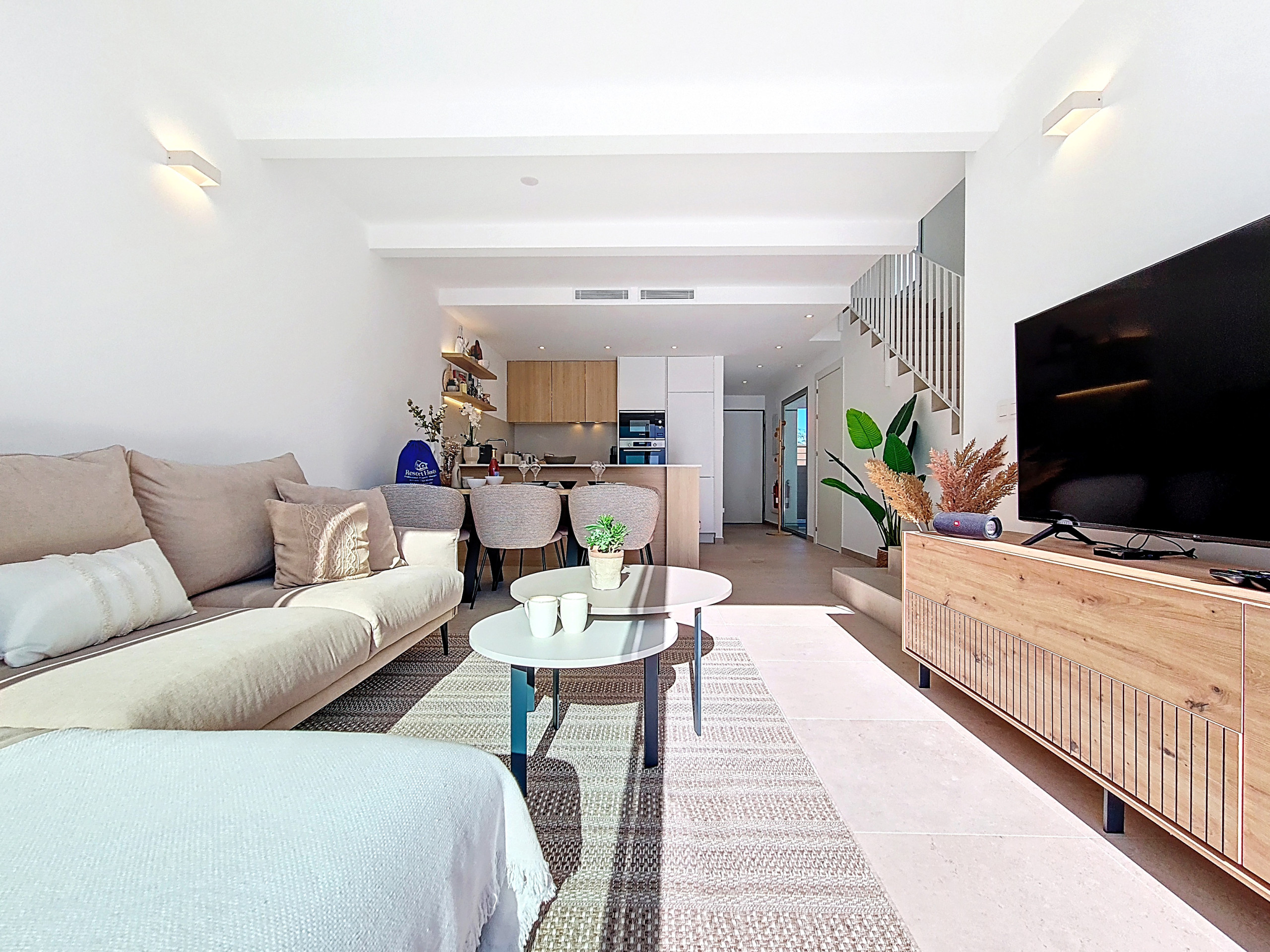 Первый этаж отличается светлой планировкой открытого типа, со стильной, полностью оборудованной кухней, переходящей в обеденную и гостиную зоны. Хозяйственное помещение под лестницей вмещает стиральную машину, а уютная гостиная с удобными сиденьями и Smart-телевизором идеально подходит для отдыха после дня, проведенного на солнце.
