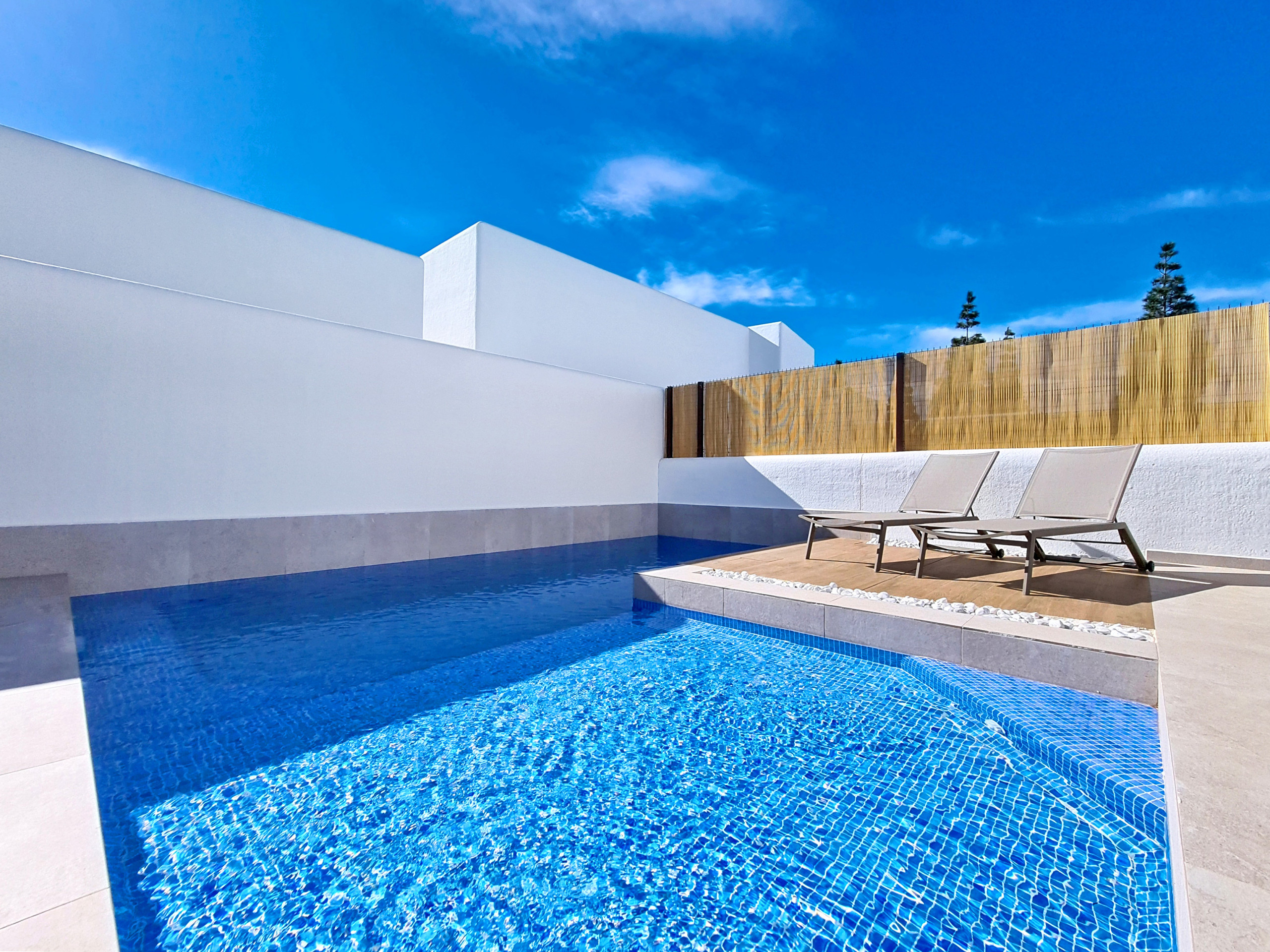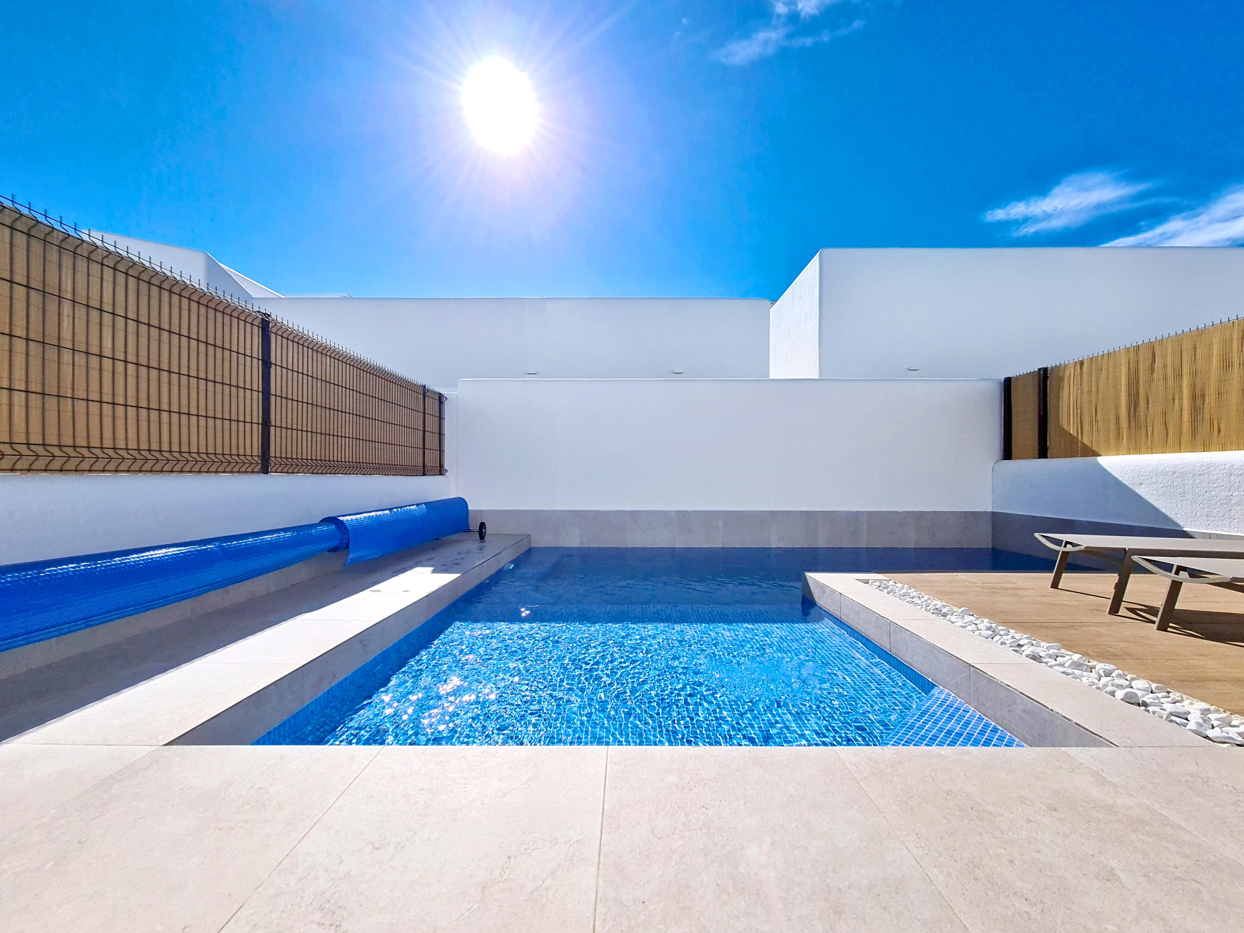 На улице частный П-образный бассейн расположен в хорошо продуманном садовом пространстве, предлагая шезлонги для отдыха на солнце, а также обеденный стол со стульями для приема пищи на открытом воздухе. Эта уютная зона идеально подходит для всего - от ленивых послеобеденных часов у бассейна до общительных вечеров, проведенных за ужином под испанским небом.