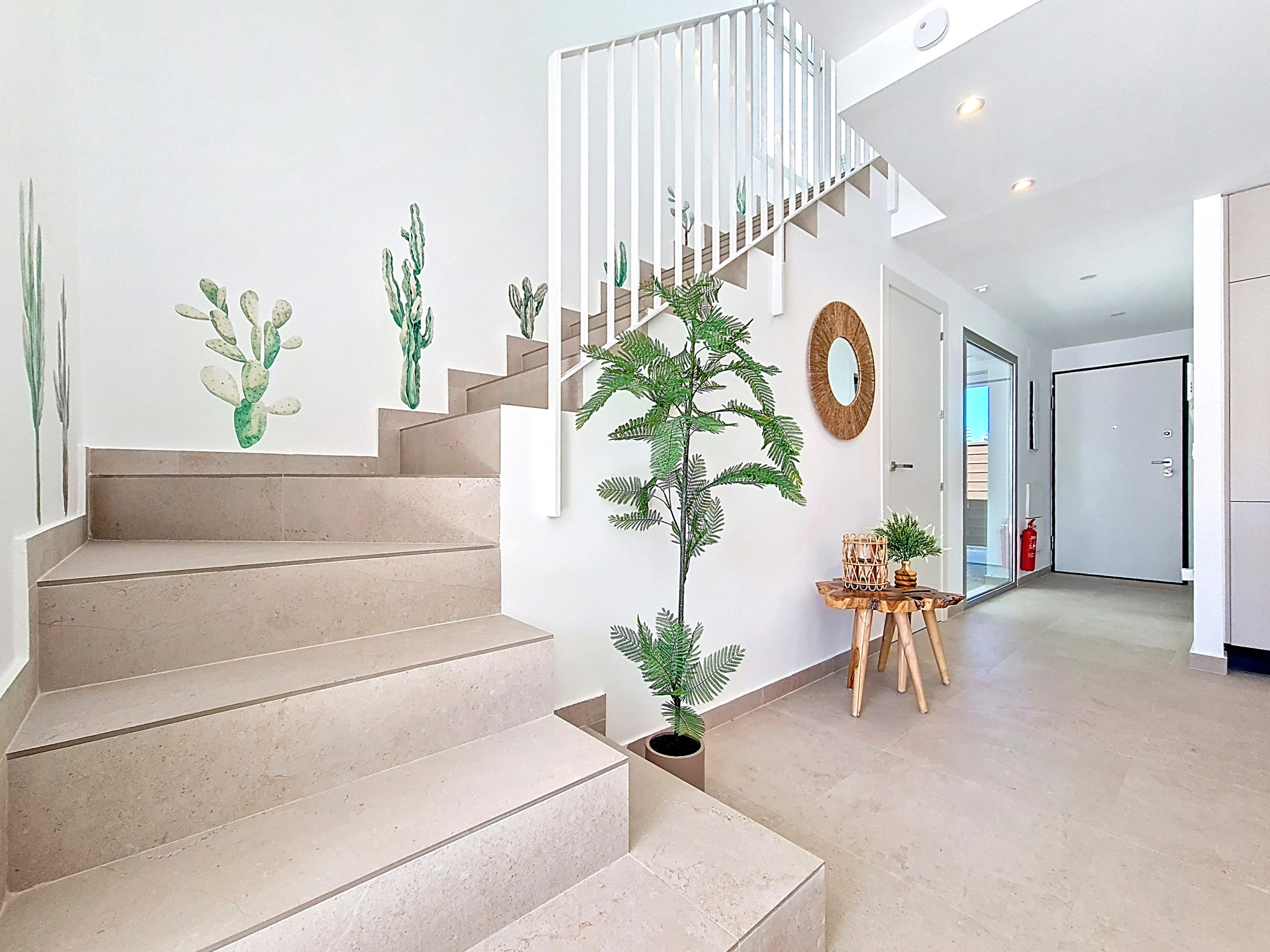 Первый этаж отличается светлой планировкой открытого типа, со стильной, полностью оборудованной кухней, переходящей в обеденную и гостиную зоны. Хозяйственное помещение под лестницей вмещает стиральную машину, а уютная гостиная с удобными сиденьями и Smart-телевизором идеально подходит для отдыха после дня, проведенного на солнце.