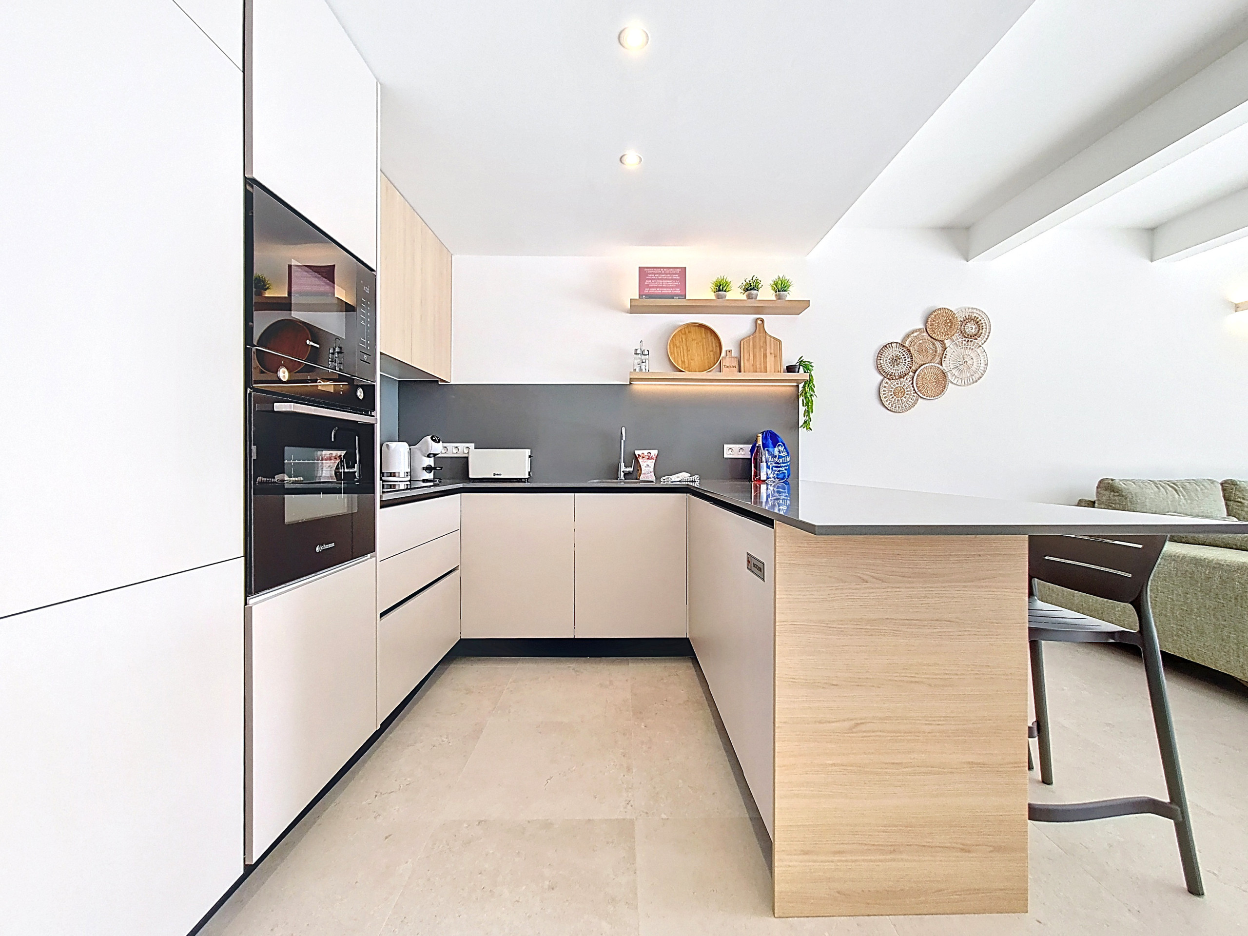 Светлая гостиная с открытой планировкой наполнена естественным светом и продуманно спроектирована для комфортной жизни. Полностью оборудованная кухня с элегантной отделкой и барной стойкой дополнена просторной гостиной с большим Smart-телевизором. По всей вилле натуральные древесные тона и мягкие, теплые акценты создают уютную, но стильную атмосферу. Отдельная хозяйственная зона с стиральной машиной обеспечивает дополнительное удобство. Большие раздвижные двери выходят прямо в сад и к бассейну, seamlessly соединяя внутреннее и наружное пространство.