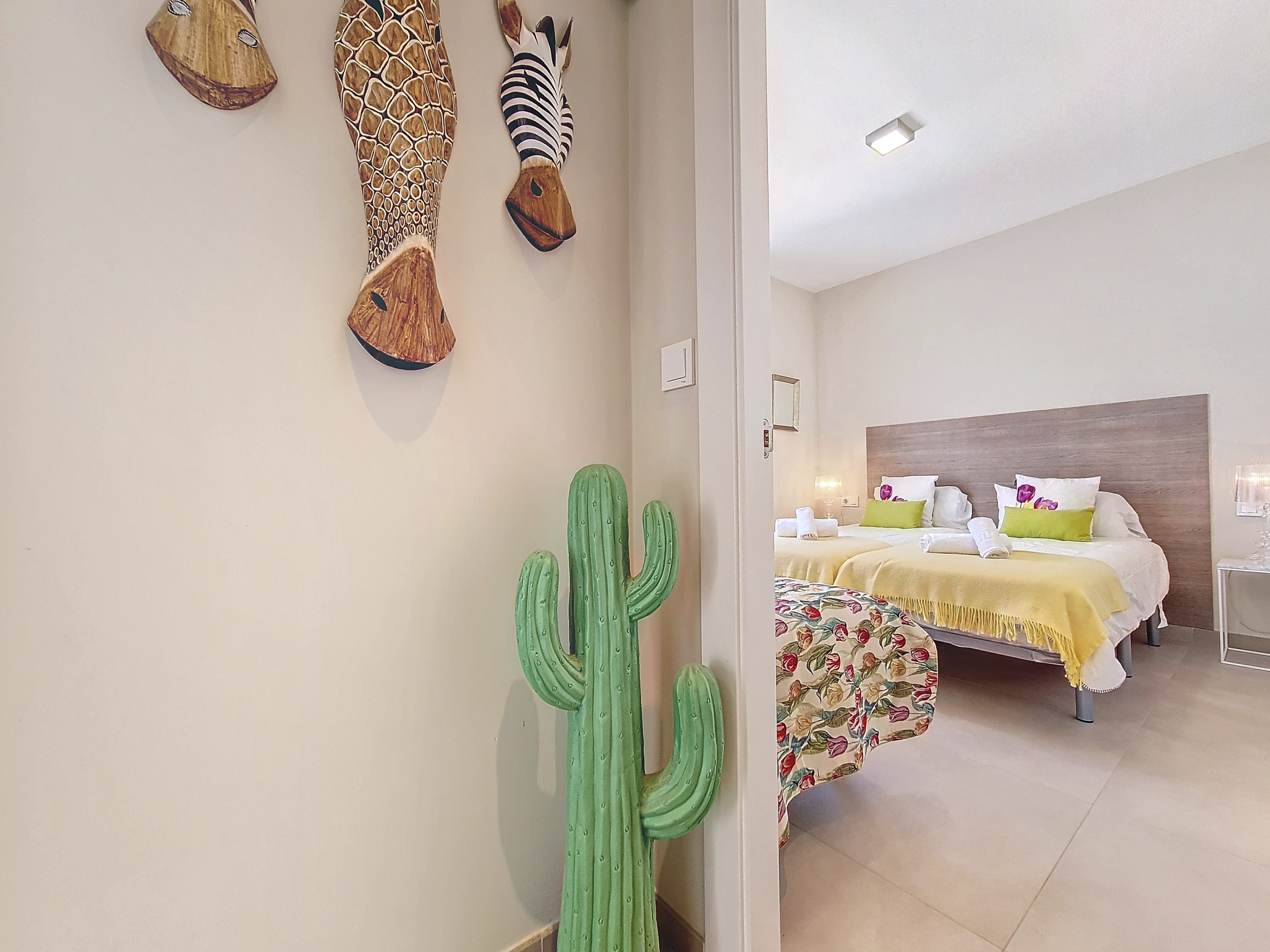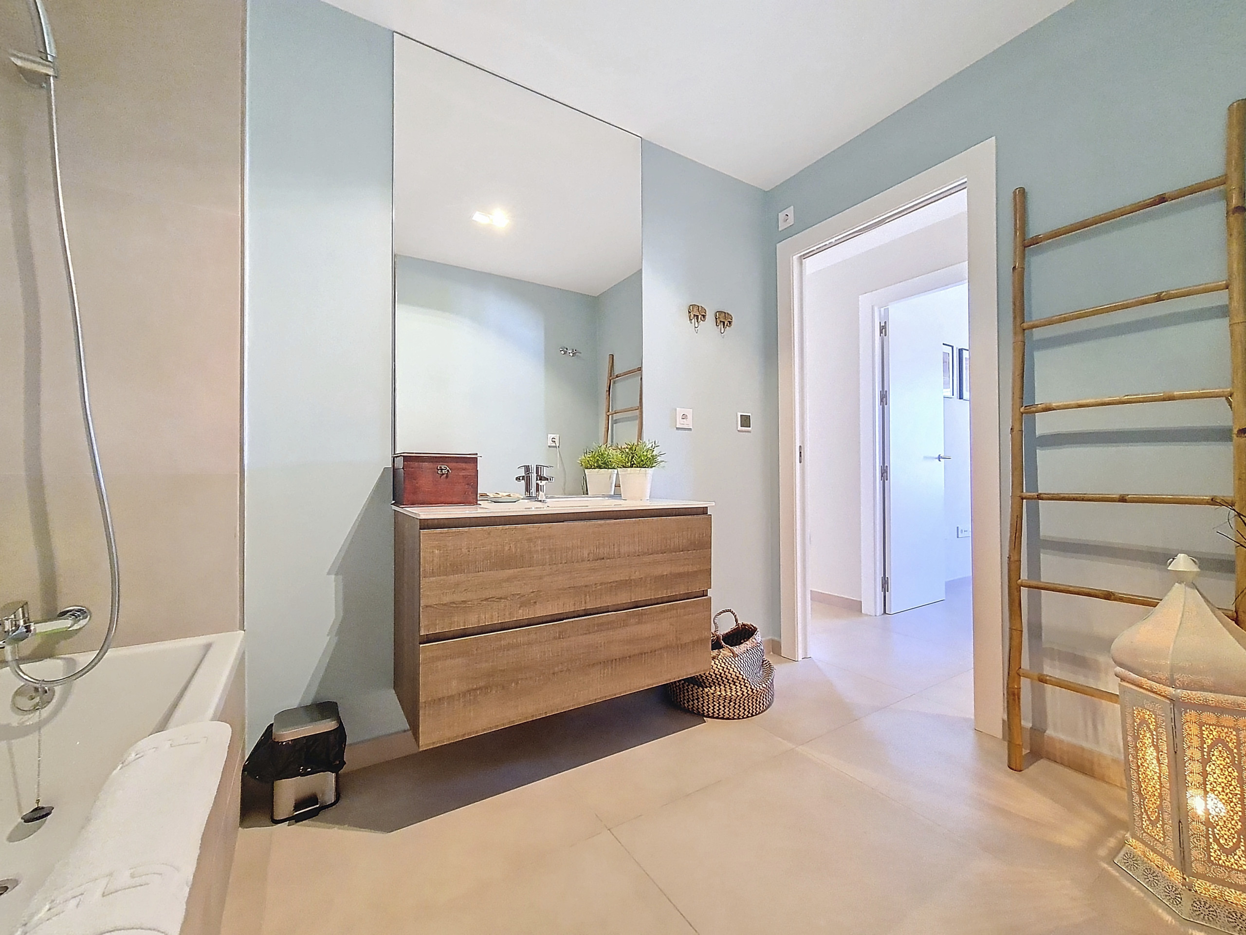 Вилла имеет 3 спальни и 2 ванные комнаты. Главная спальня светлая и просторная, ее двери выходят к бассейну. Рядом с ним находится просторная современная ванная комната с туалетом и душевой кабиной.