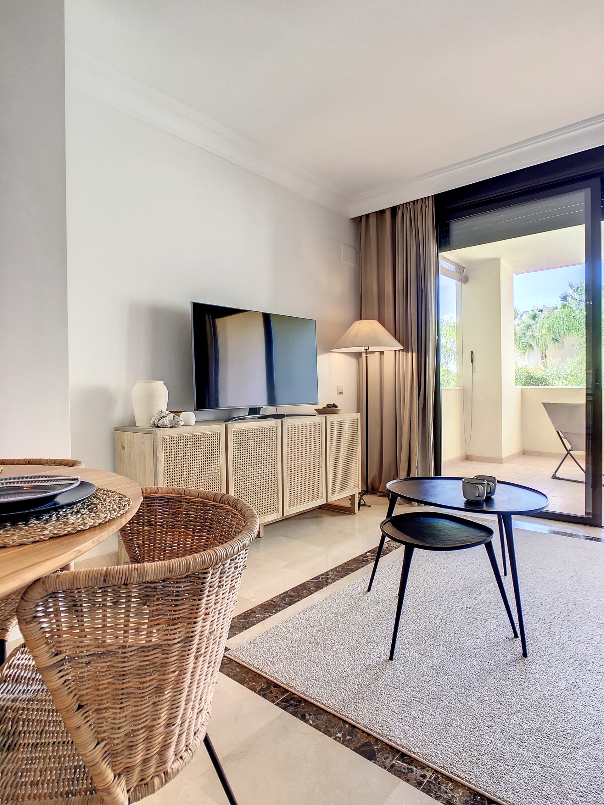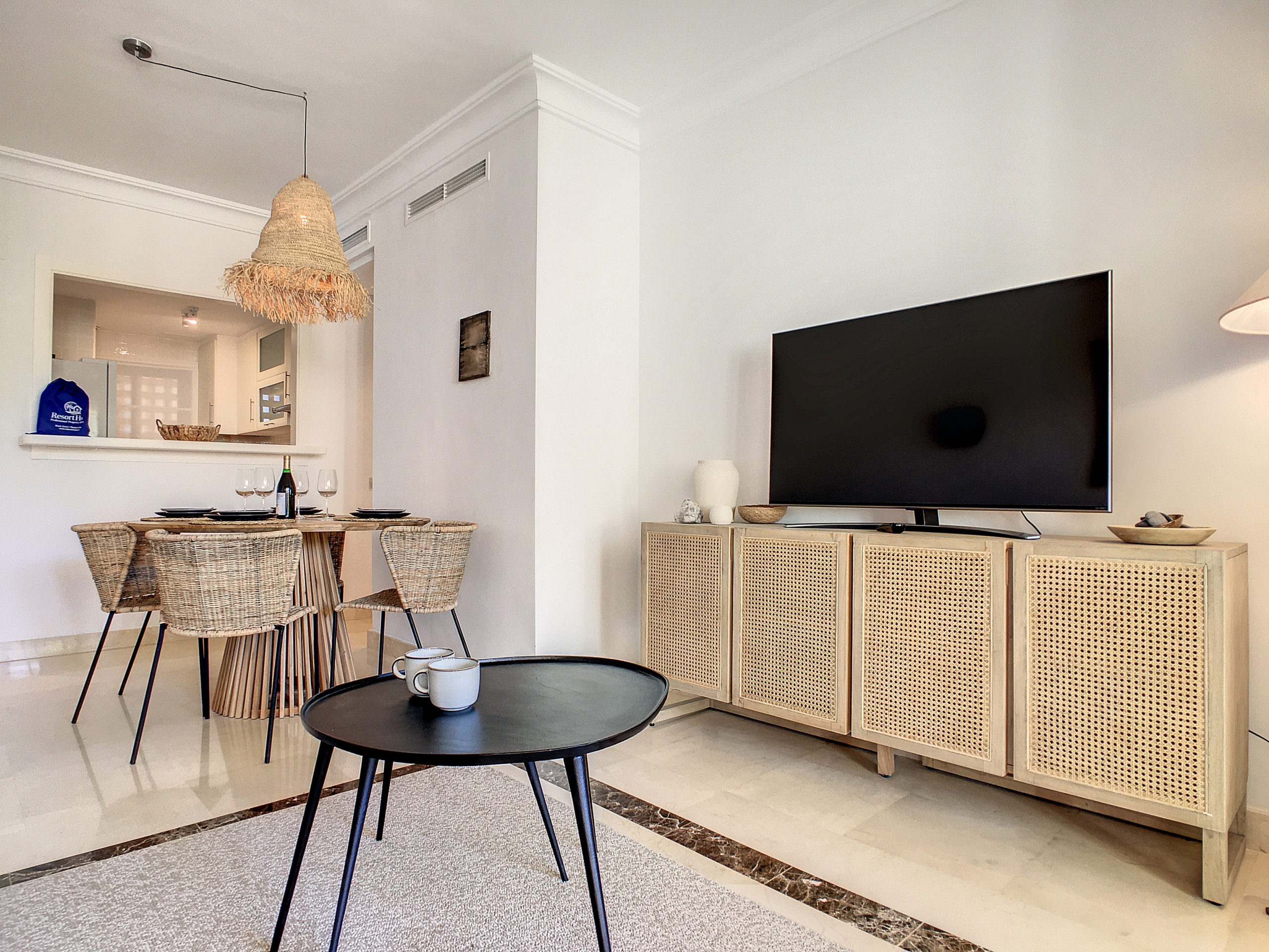 Она полностью оборудована современной бытовой техникой, включая посудомоечную и стиральную машины. В светлой и удобной гостиной открытой планировки есть обеденный стол и стулья, диван и большой телевизор с технологией Smart TV и международными каналами, включая русские. Из этого пространства большая стеклянная дверь патио ведет на частную террасу. Это идеальное место, чтобы посидеть и расслабиться или пообедать всей семьей.