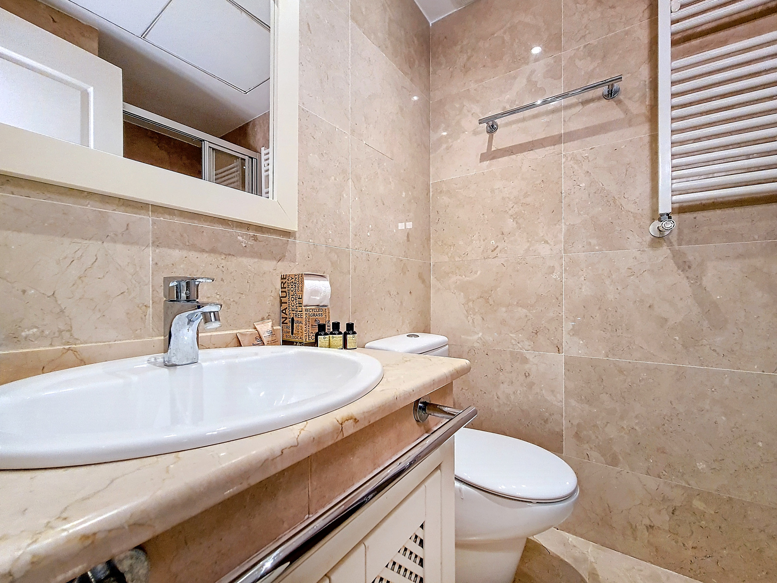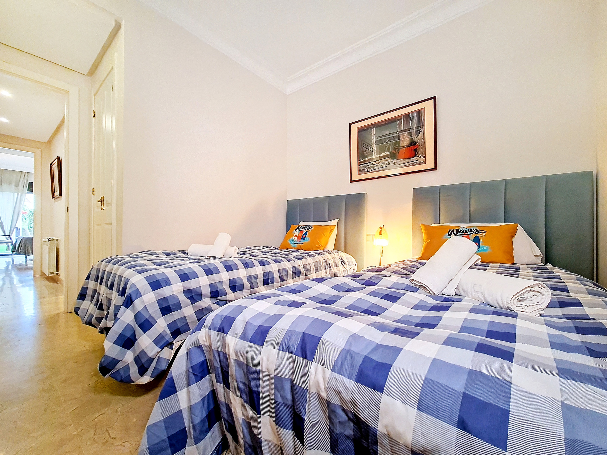 В апартаментах есть две красивые просторные спальни. Главная спальня с дверями на террасу — идеальное место для отдыха с удобной двуспальной кроватью и встроенными шкафами, предлагающими много места для хранения вещей. В спальне также есть ванная комната с большой душевой кабиной и современной фурнитурой. Вторая спальня уютная и идеально подходит для детей, друзей или дополнительных гостей. Она со вкусом обставлена двумя односпальными кроватями и удобно расположена рядом со второй ванной комнатой, в которой также есть душевая кабина.