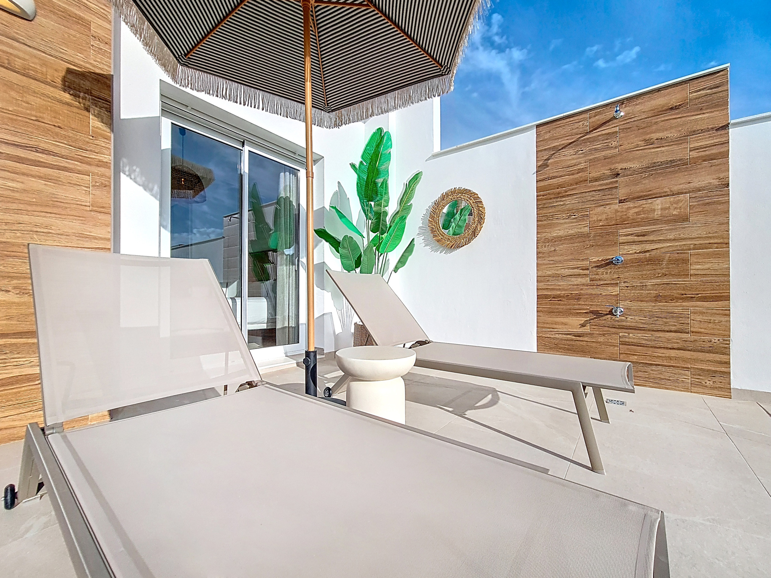 Снаружи спереди есть большая терраса с шезлонгами и обеденным столом со стульями, предлагающая достаточно места для отдыха, принятия пищи или принятия солнечных ванн рядом с бассейном. В задней части виллы частный внутренний дворик обеспечивает более защищенное место для наслаждения тихим кофе или вечерним напитком. Здесь есть небольшой стол со стульями, и он доступен как из кухонной зоны, так и из одной из спален. Отсюда ступеньки ведут непосредственно на просторную террасу на крыше.