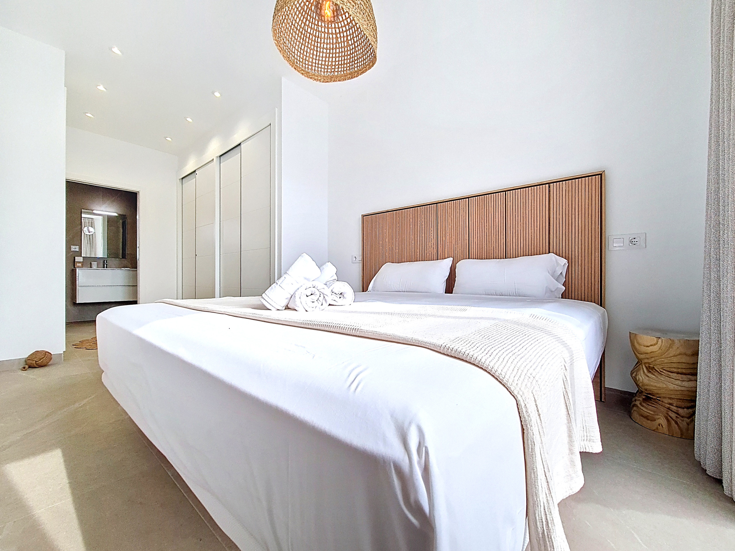 Внутри вилла отличается светлой, открытой планировкой, стильно оформленной и выполненной на высоком уровне, с легкой, современной и уютной атмосферой. Полностью оборудованная кухня плавно переходит в обеденную и гостиную зоны, создавая гостеприимное пространство для отдыха или развлечений. В гостиной есть большой Smart-телевизор и высокоскоростной Wi-Fi, поэтому вы можете оставаться на связи во время своего пребывания. Большие раздвижные двери открываются прямо на террасу и к бассейну, позволяя естественному свету заливать пространство и создавая беспрепятственную связь между интерьером и экстерьером.