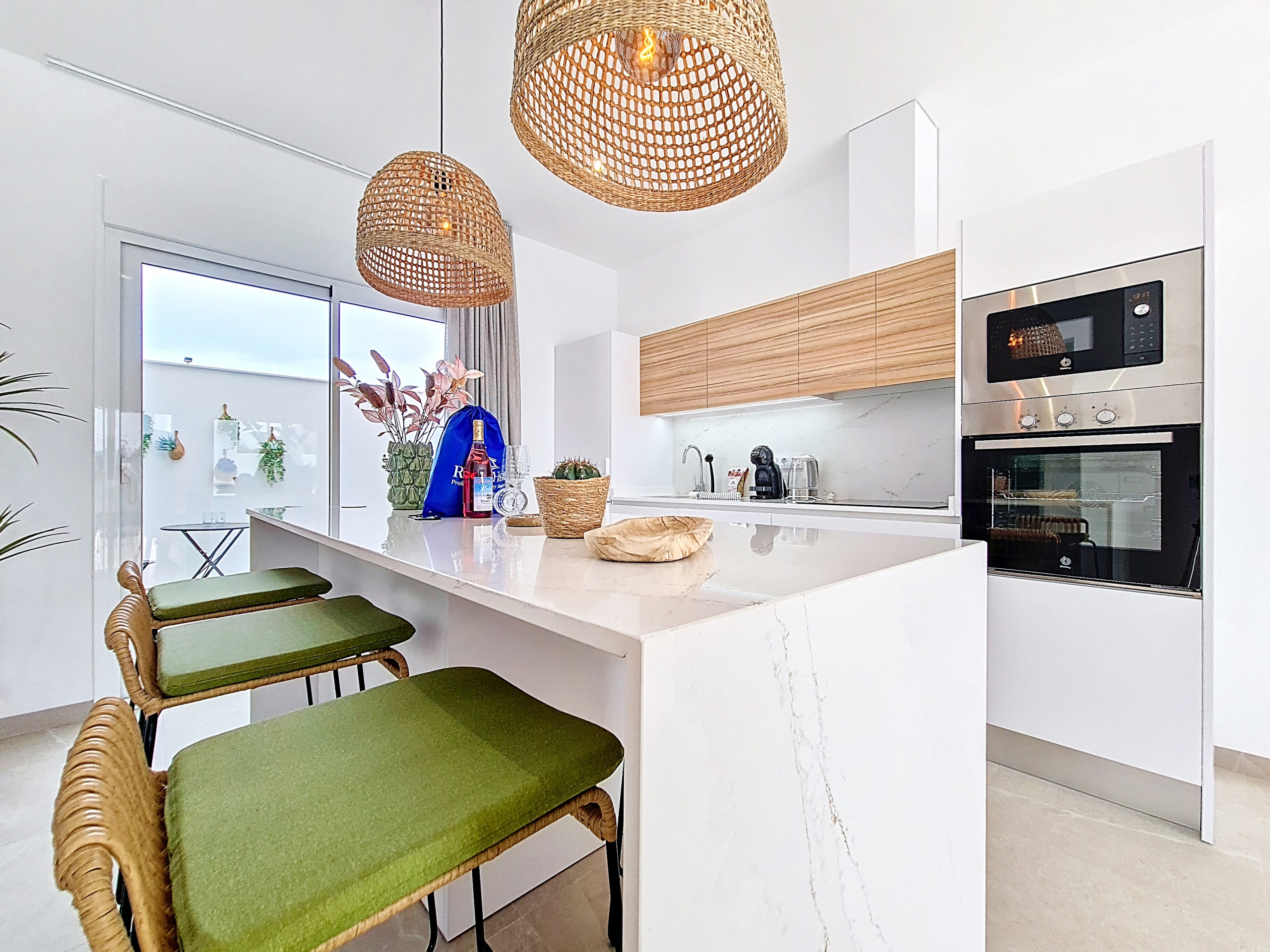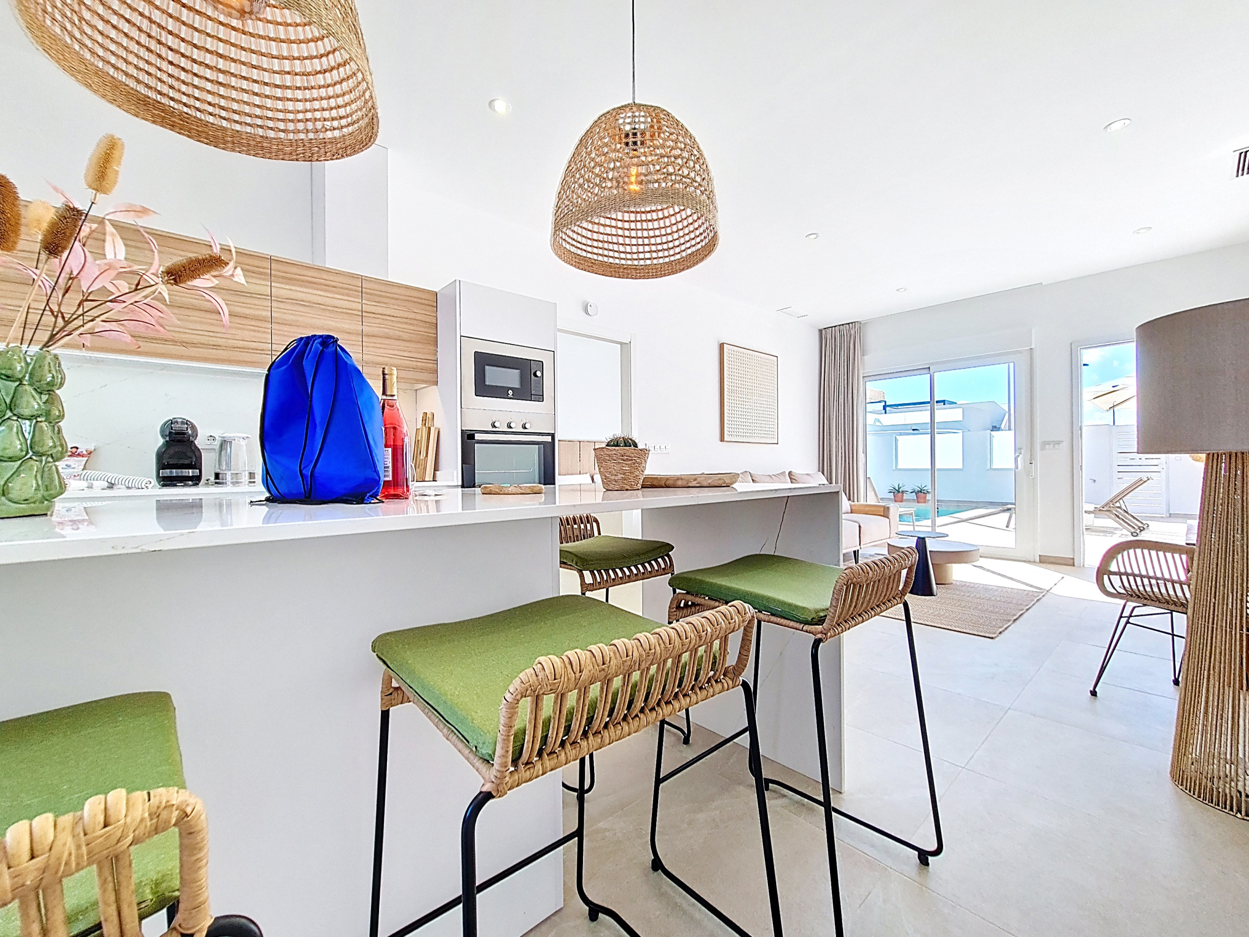 Открытая планировка создает светлое и просторное пространство, современная кухня полностью оборудована и плавно переходит в гостиную и обеденную зону. Раздвижные стеклянные двери выходят на террасу с частным бассейном, создавая единое пространство внутри и снаружи — идеально для наслаждения солнцем.
