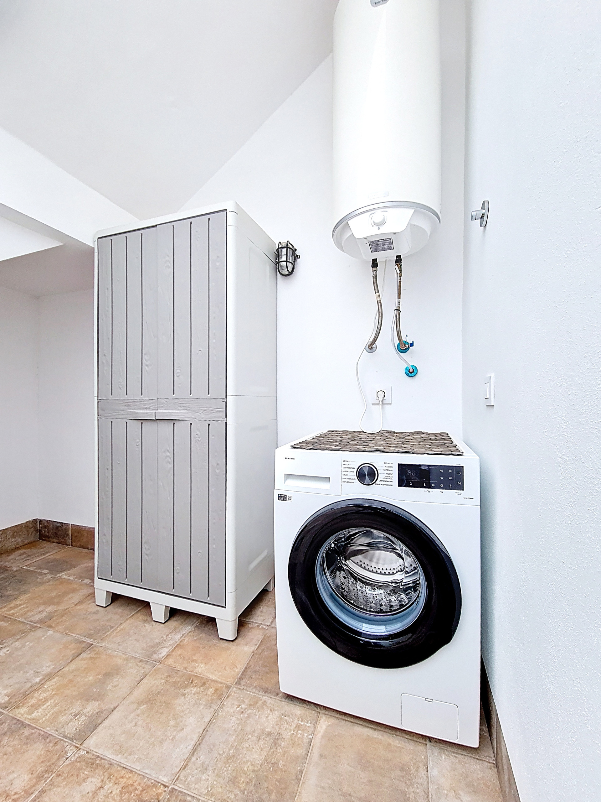 ∙Задний двор с столом и стульями, стиральной машиной и лестницей на крышу-террасу