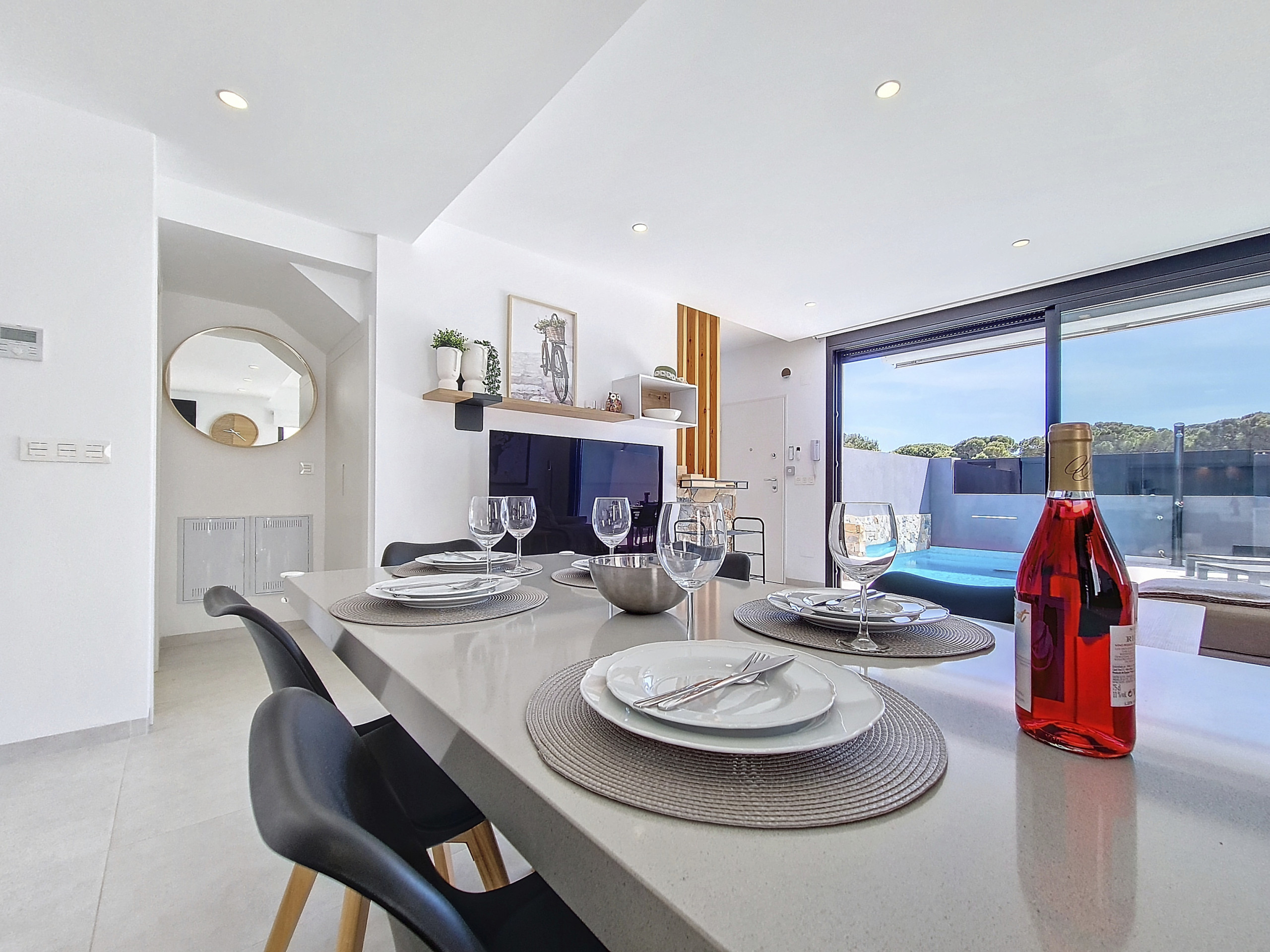 В просторной гостиной и столовой открытой планировки есть большой телевизор с технологией Smart TV, а на кухне есть все необходимое для отдыха. Вилла одновременно стильная и уютная, имеет большие раздвижные двери патио, ведущие на террасу первого этажа и к бассейну.