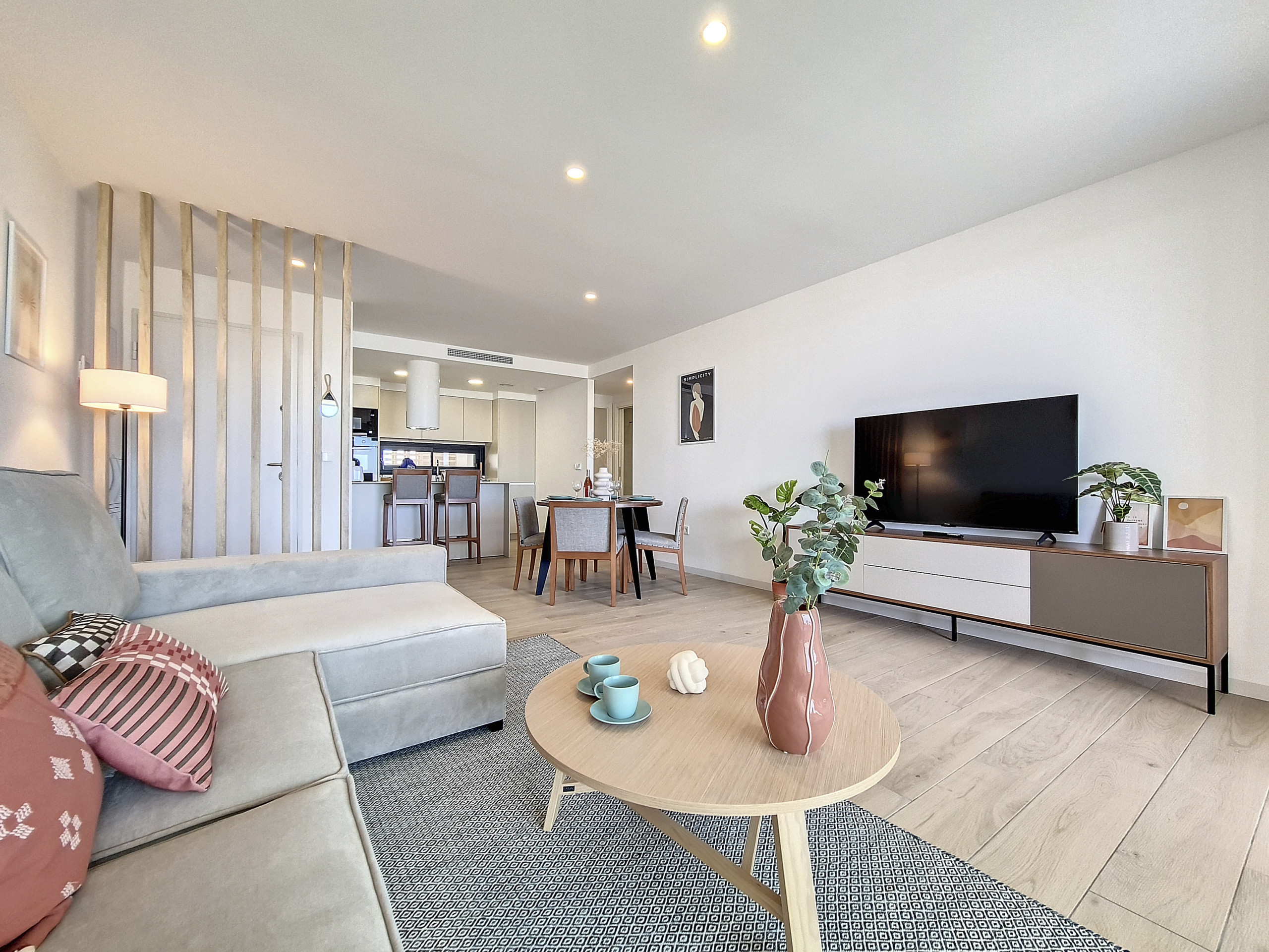 Внутри вы найдете просторную и светлую гостиную, столовую и кухню открытой планировки с гладкой современной отделкой. Раздвижные двери ведут на собственный балкон с уютной зоной отдыха. Это расслабляющее пространство идеально подходит для утреннего кофе или отдыха с видом на комплекс, окружающий ландшафт и общий бассейн.