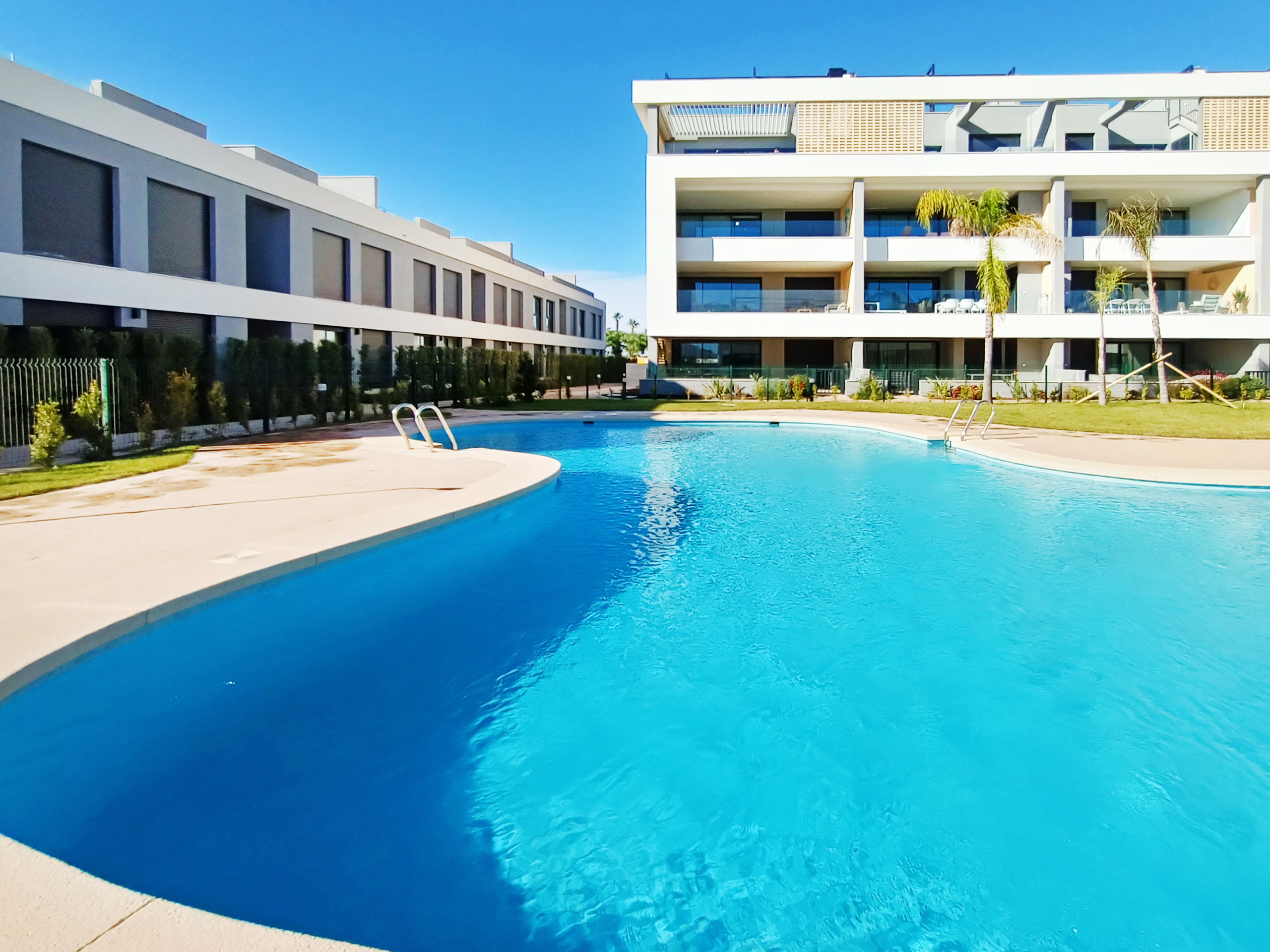 New, well-equipped apartment with a large balcony overlooking the pool.