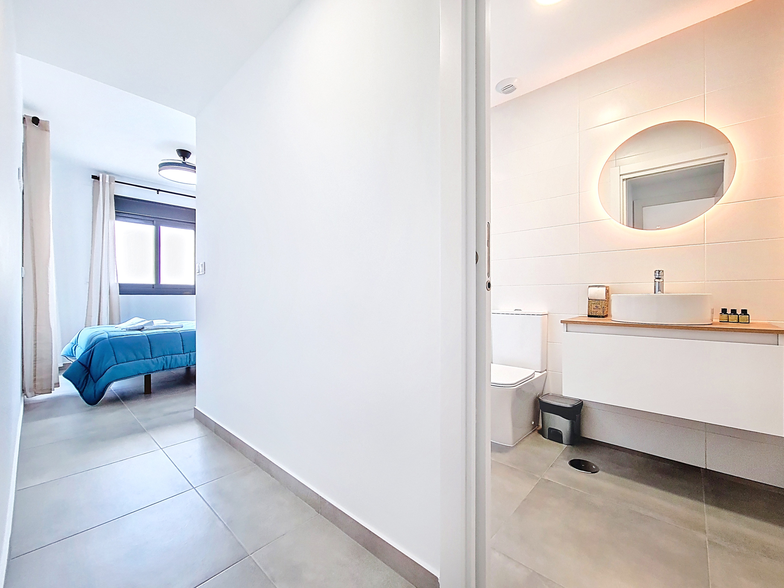 В светлой и со вкусом обставленной главной спальне есть ванная комната с душевой кабиной и выходом на второй балкон. Вторая спальня, не менее светлая и уютная, идеально подходит для детей или гостей. Элегантная гостевая ванная комната, также с душевой кабиной, расположена между двумя спальнями для дополнительного удобства. Эти стильные апартаменты предлагают современные удобства, такие как кондиционер, смарт-телевизор и высокоскоростной Wi-Fi, чтобы вы оставались в прохладе и на связи во время вашего пребывания. Апартаменты предлагают доступ к ухоженному общему бассейну с гидромассажной ванной и детским бассейном. Также есть небольшой открытый тренажерный зал и детская игровая площадка. Это идеальное место, чтобы охладиться или расслабиться с семьей или друзьями под средиземноморским солнцем.