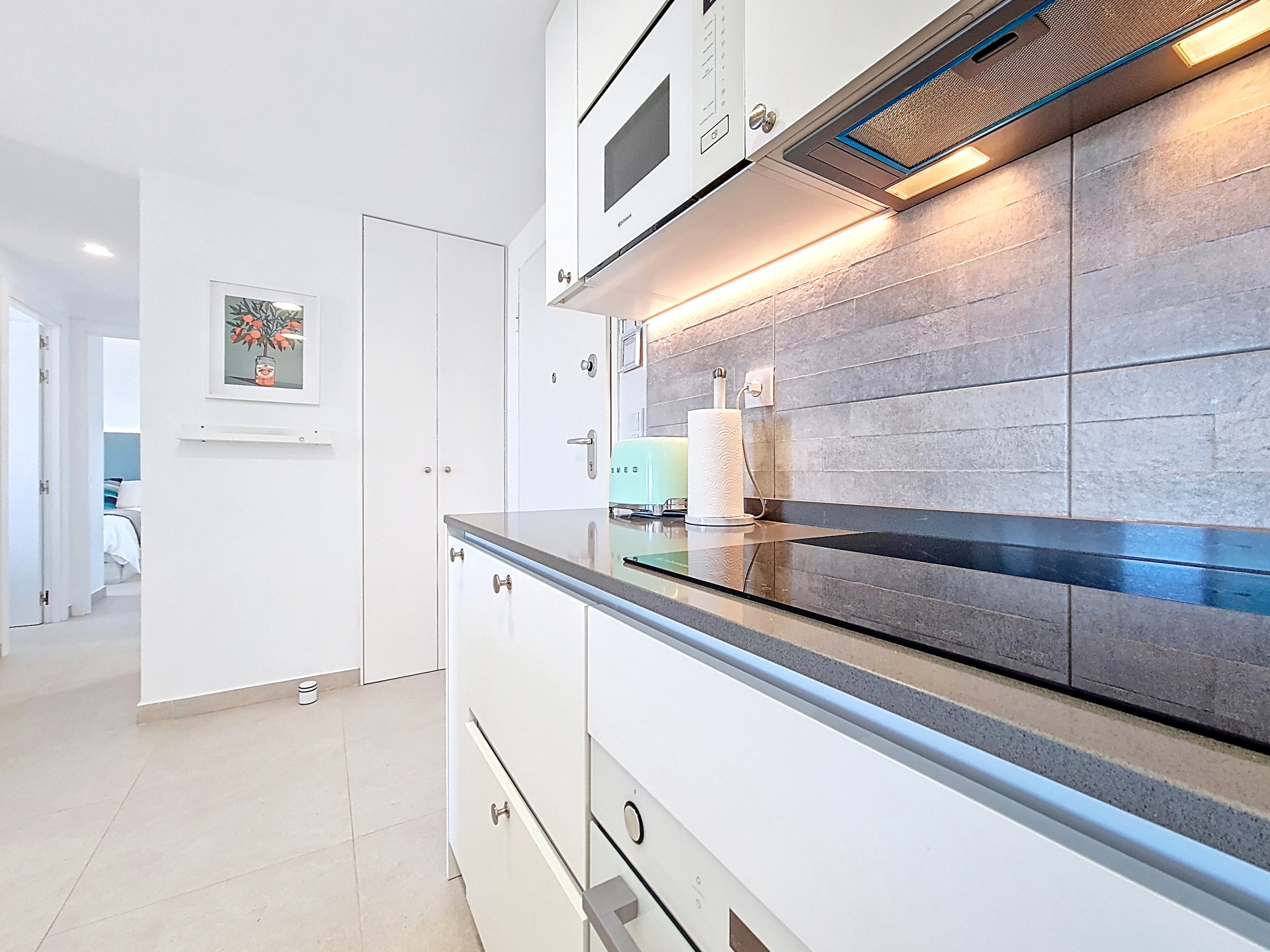 Полностью оборудованная кухня оснащена современной техникой и всем необходимым для комфортного проживания. Второй, меньший балкон, на который можно попасть как из кухни, так и из главной спальни, добавляет еще больше очарования квартире и предлагает открытое пространство с небольшим столом и стульями.